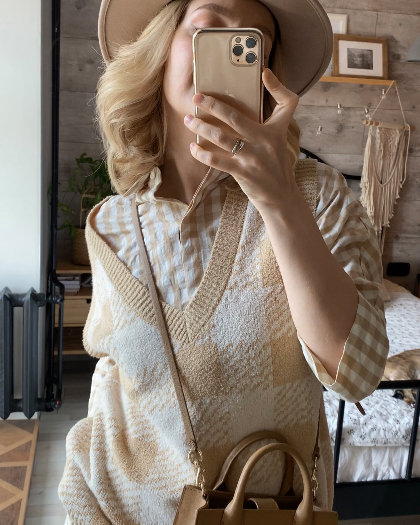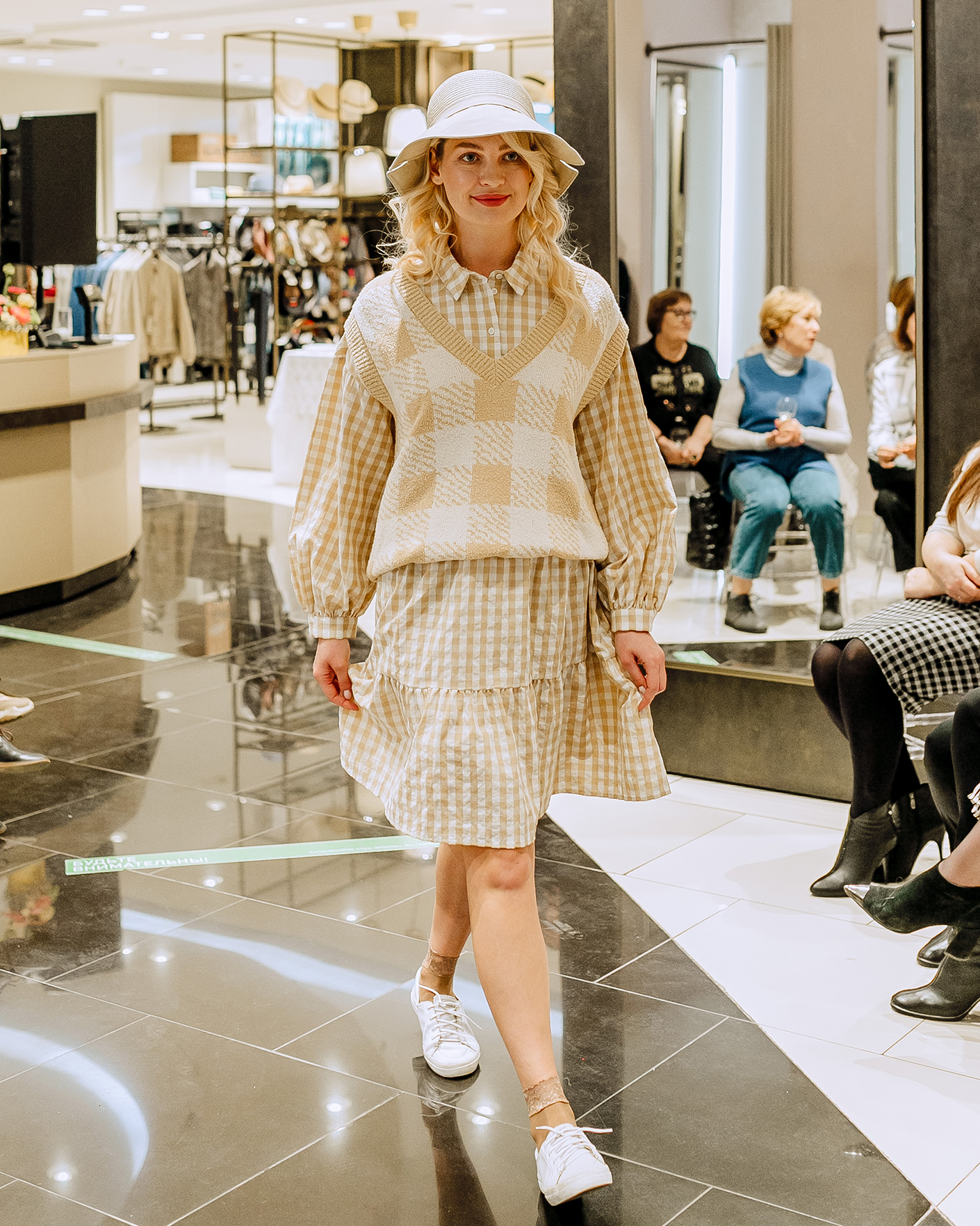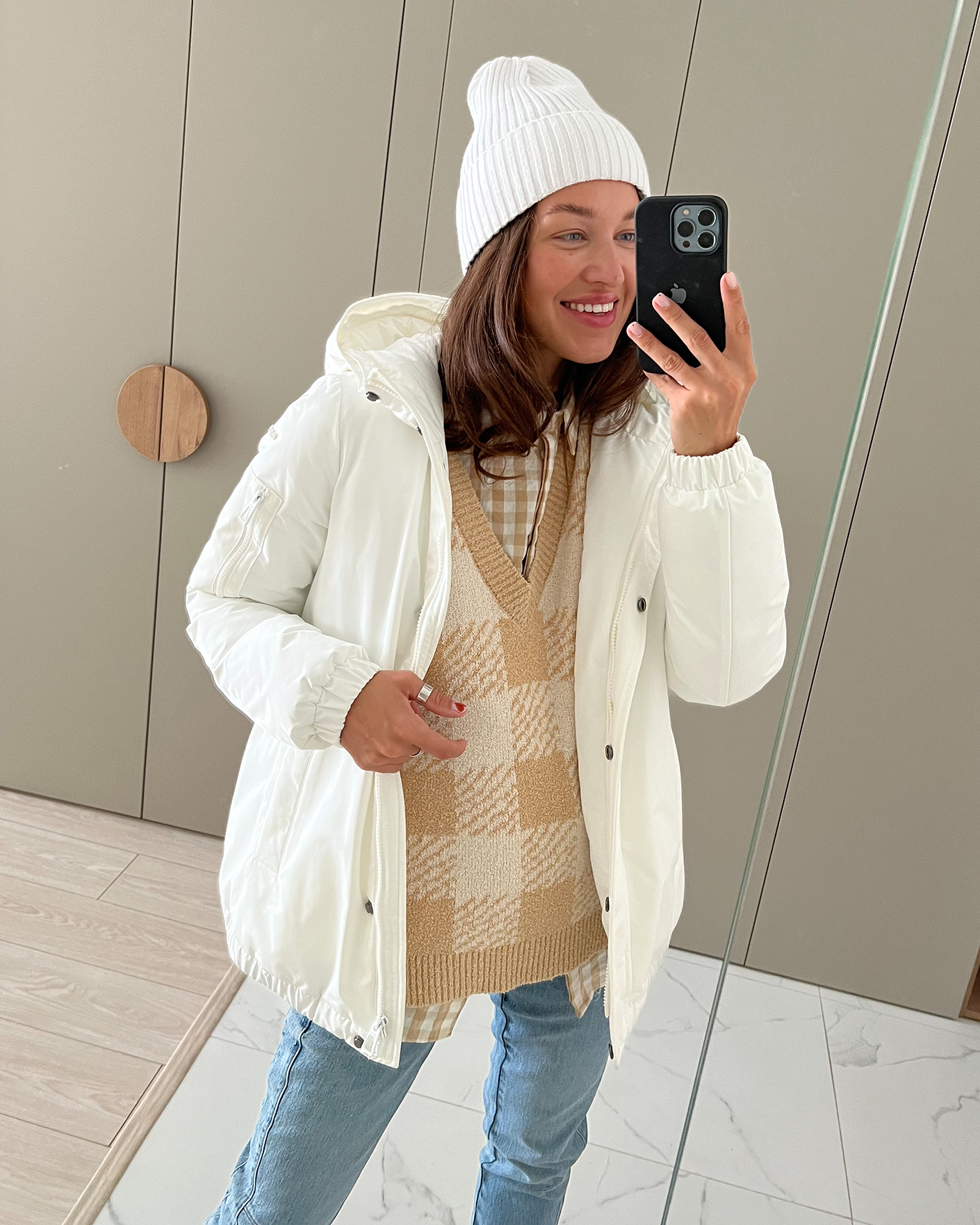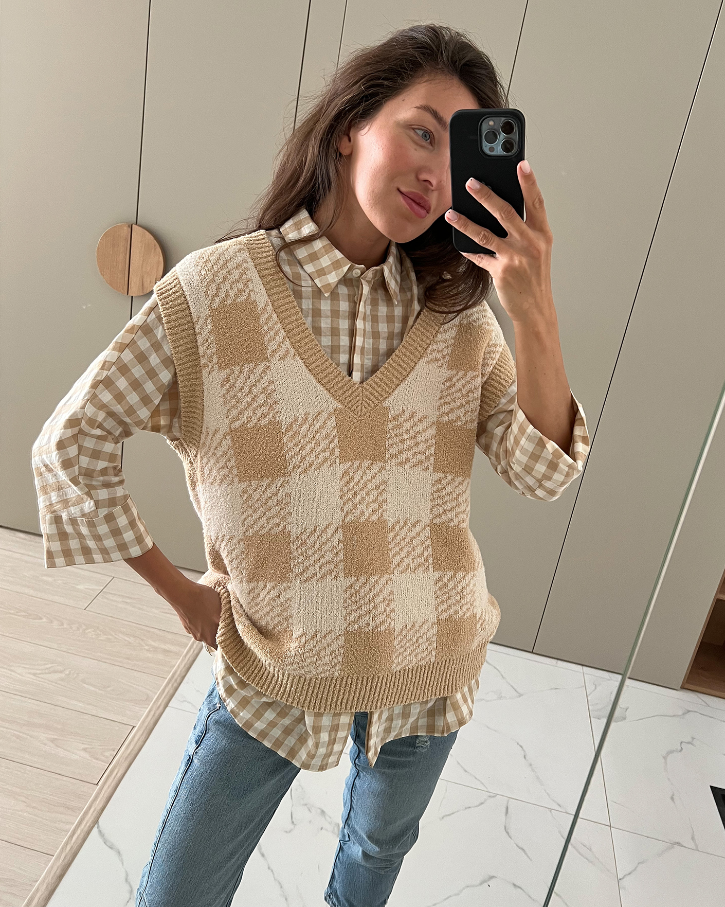 Свободный жилет OUI бело-бежевого цвета в крупную клетку. Текстурная модель с V-образным вырезом, спущенной линией плеча и низом на широкой тонкой резинке. Жилет можно сочетать с футболкой, тонкой водолазкой, рубашкой, блузой, платьем, юбкой и брюками.