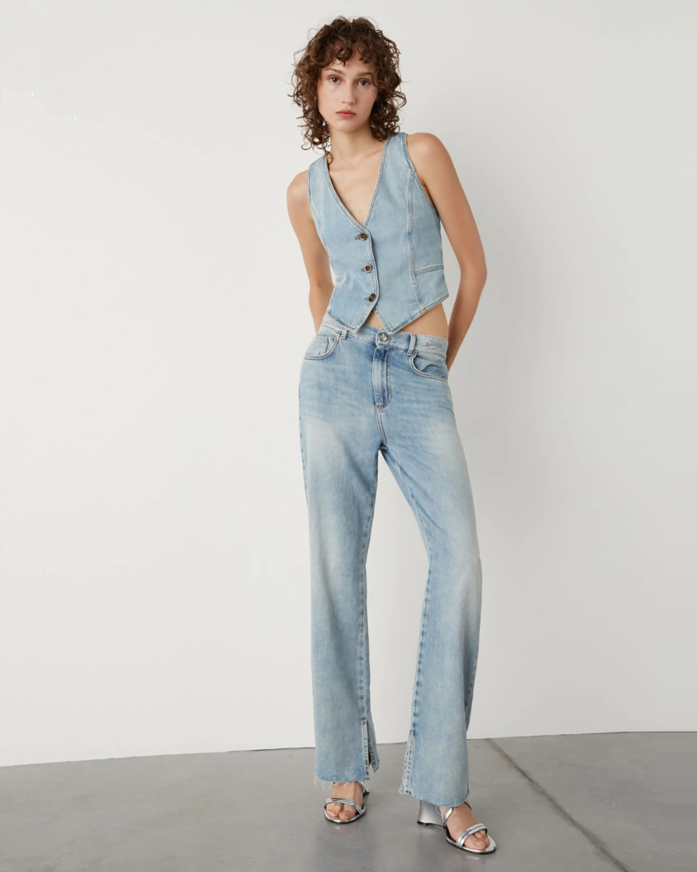 Джинсовый жилет Marella голубого цвета выполнен из 100% хлопка. Модель с V-образным вырезом и застежкой на три пуговицы. Стильный жилет можно носить как самостоятельное изделие, так и комбинировать с футболкой, рубашкой, водолазкой.