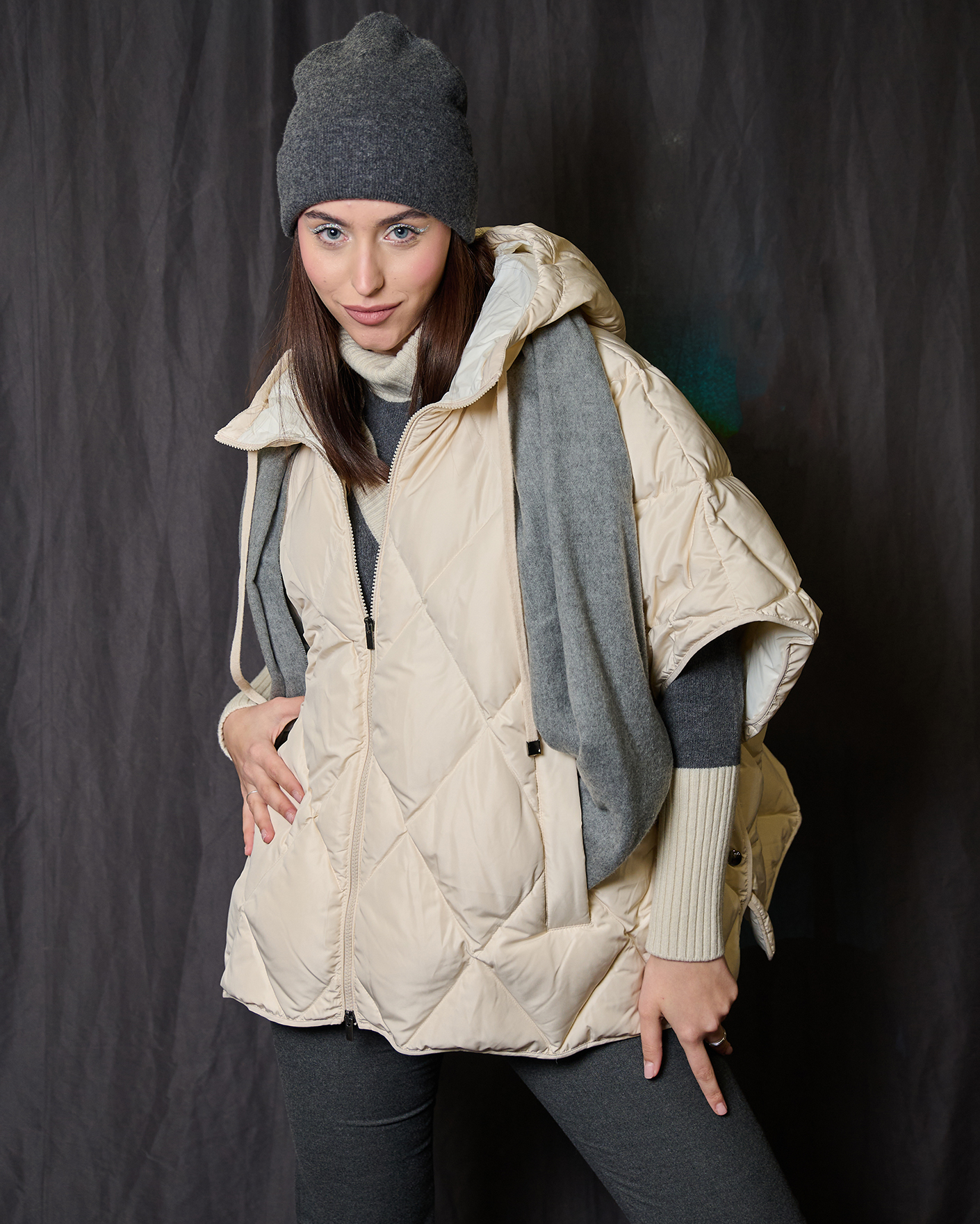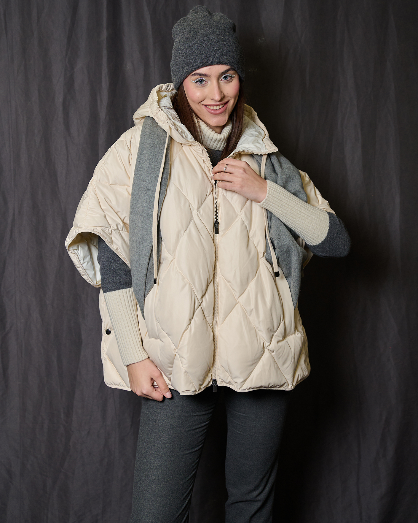 Пуховый жилет Peserico бежевого цвета в ромбическую стежку. Модель с воротником-стойка и фиксированным регулируемым капюшоном, спущенная линия плеча и застежка на молнию. Жилет отлично впишется в ваш гардероб.
