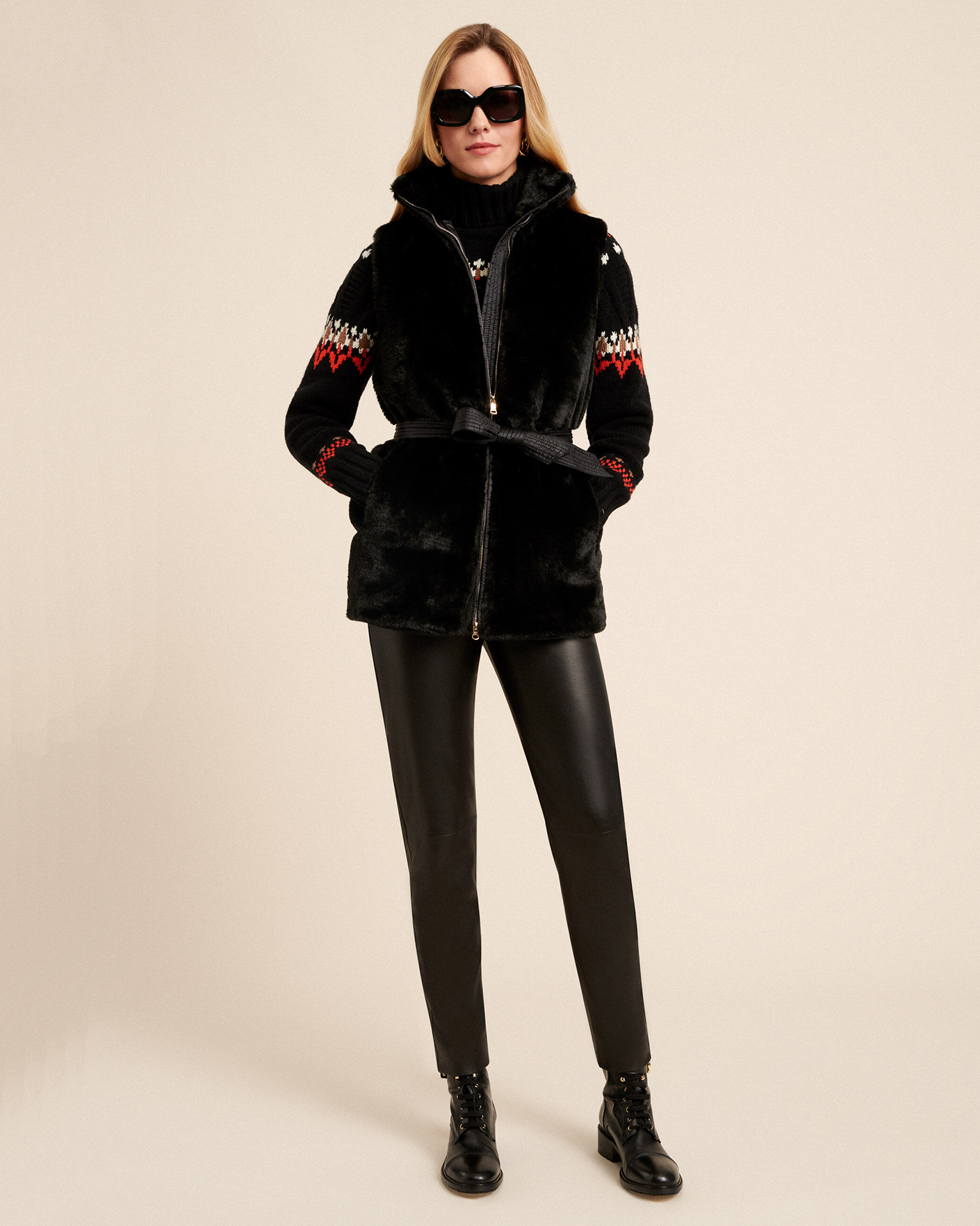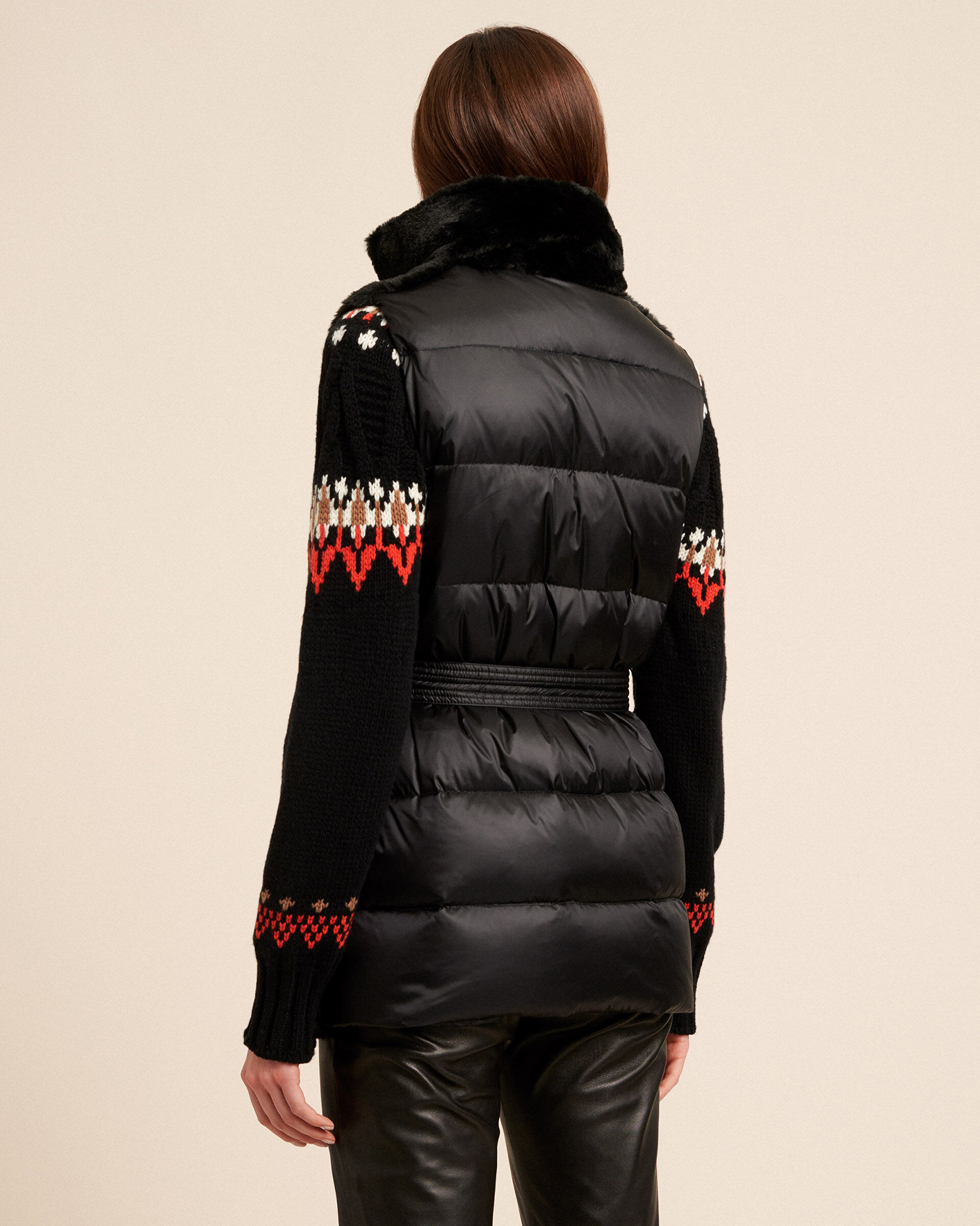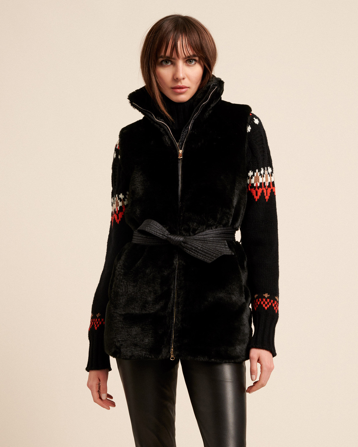 Утепленный жилет Luisa Spagnoli черно-синего цвета с поясом. Модель с искусственным мехом спереди и горизонтальной стежкой на спинке. Воротник-стойка, застежка на молнию, врезные карманы по бокам. Стильный жилет отлично впишется в ваш гардероб.