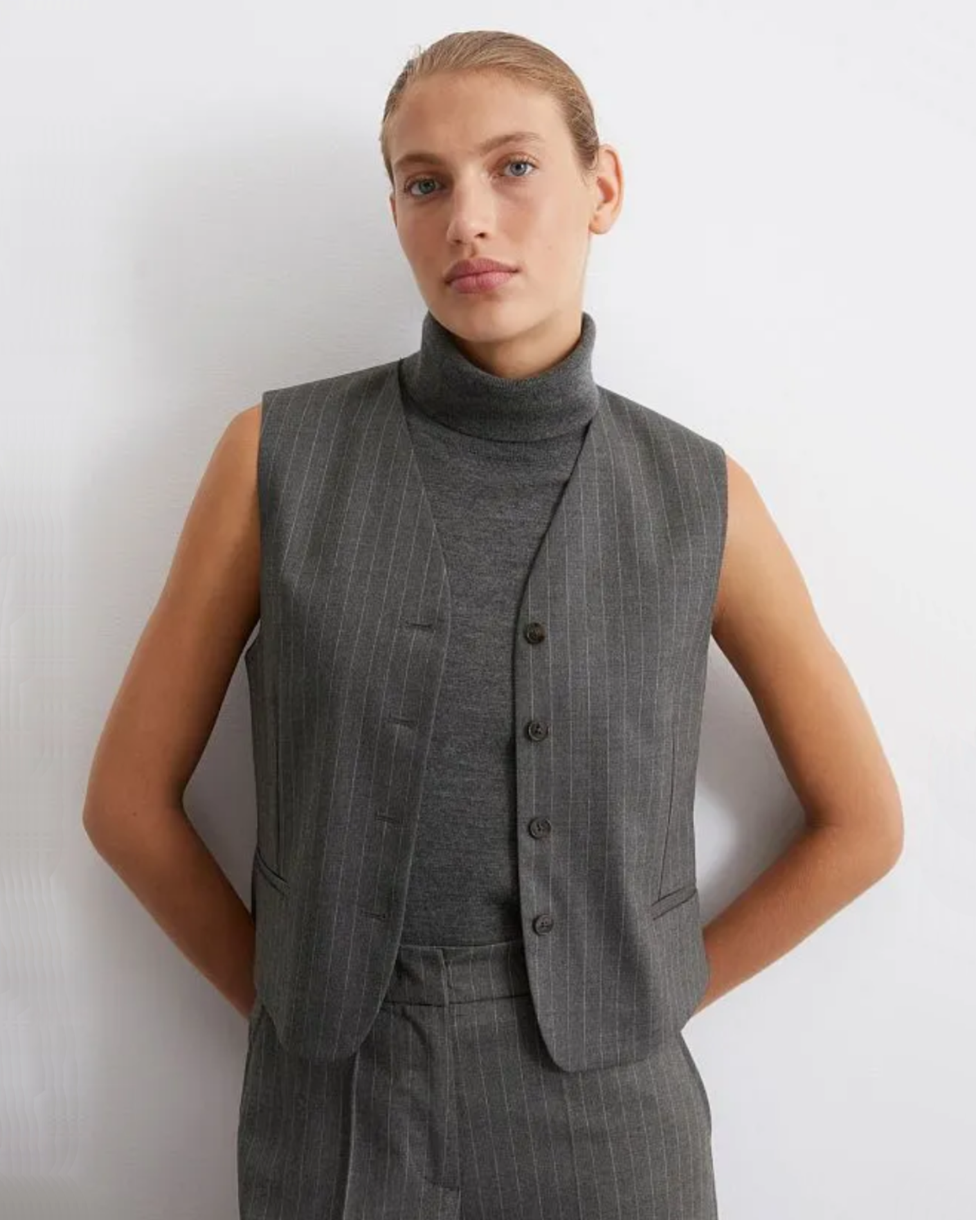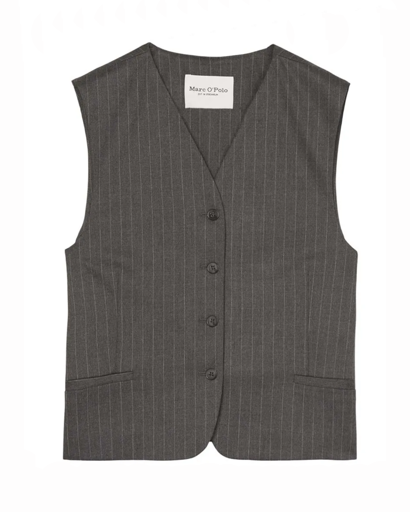 Классический жилет Marc O'Polo серого цвета в узкую вертикальную полосу. Модель с V-образным вырезом и застежкой на четыре пуговицы, имеются обманные врезные карманы. Жилет можно носить как самостоятельно, так и сочетать с рубашкой, блузой, водолазкой, брюками и юбкой.