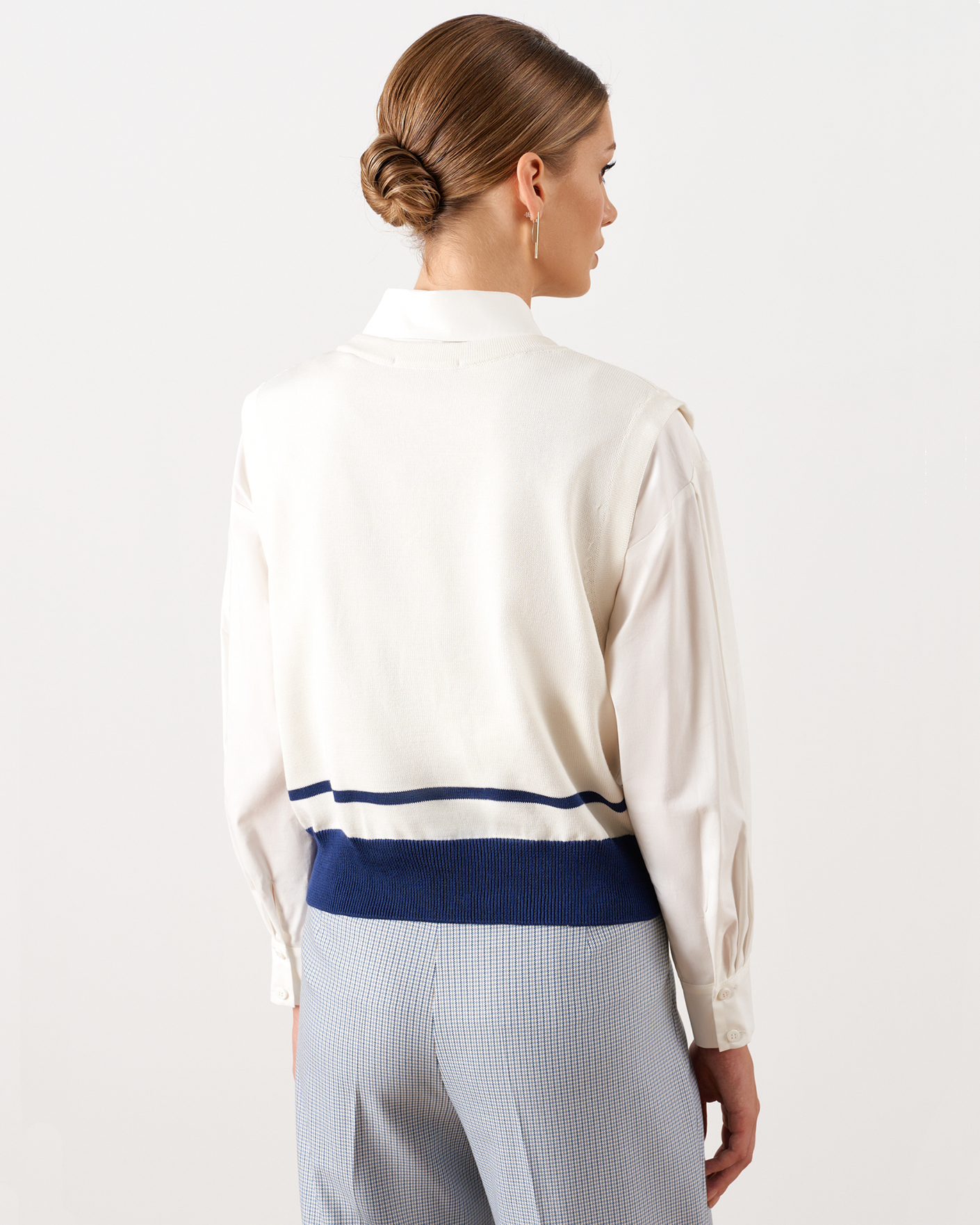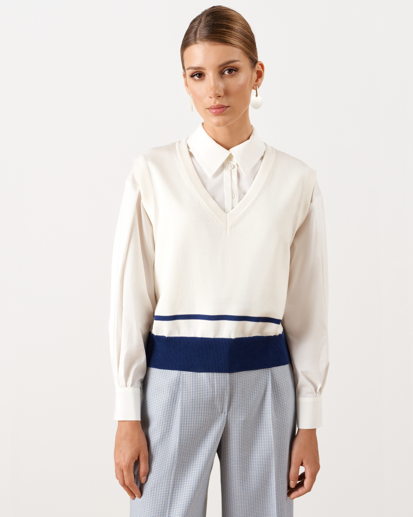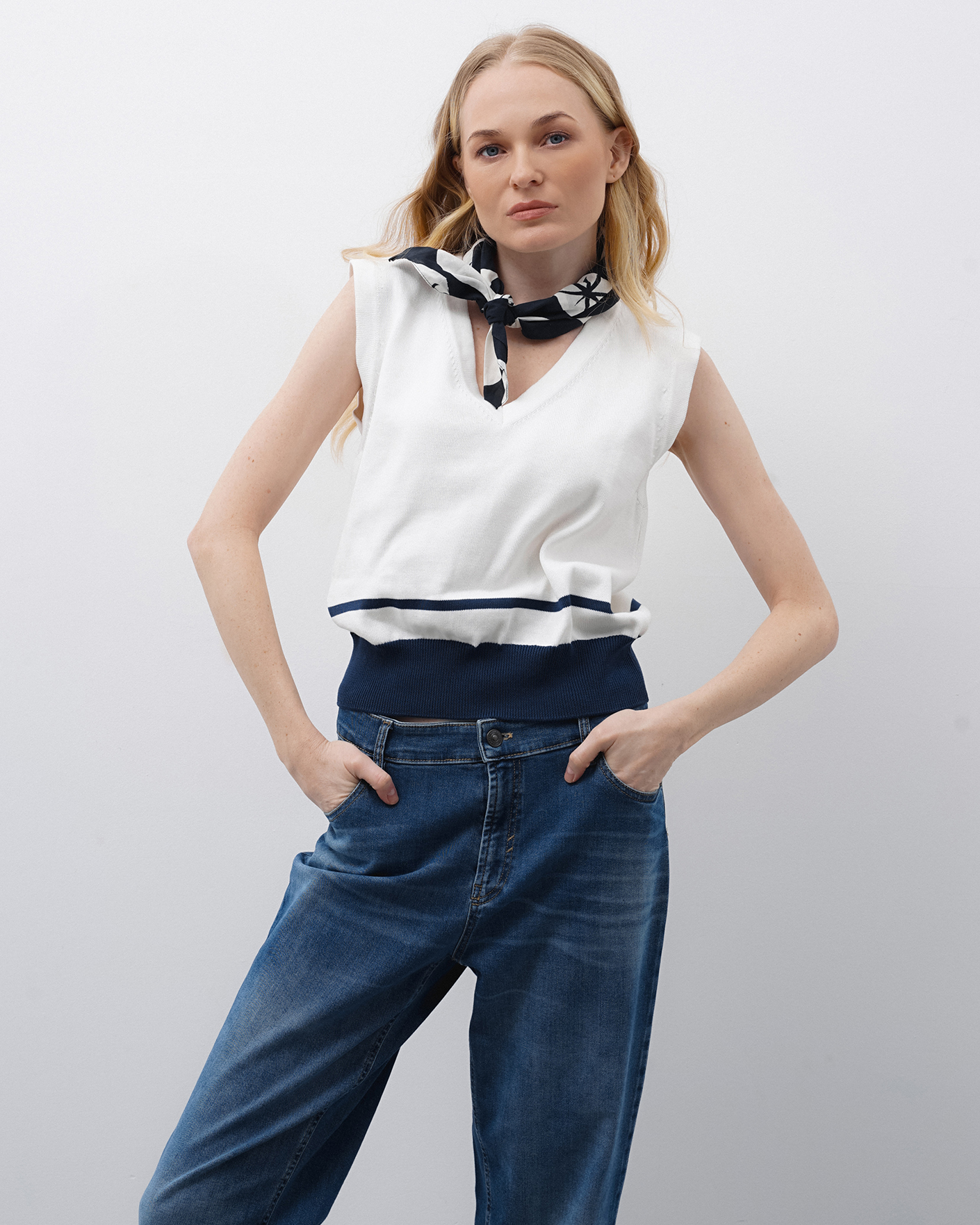 Жилет Nelva сине-белого цвета в горизонтальную полосу по низу. Модель из 100% хлопка с V-образным вырезом и краями на тонкой ребристой резинке. Жилет можно сочетать с рубашкой, блузой, водолазкой, юбкой и брюками.