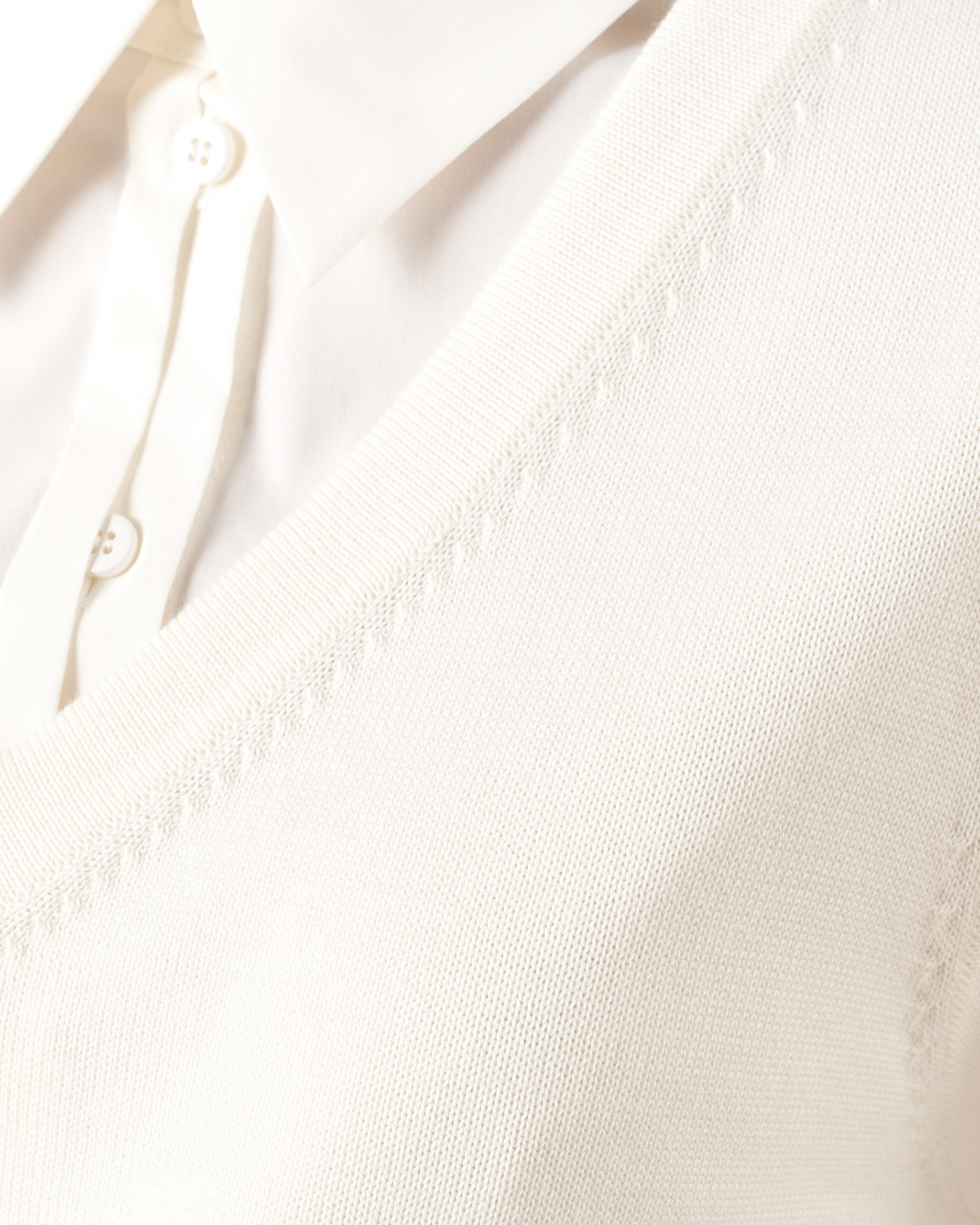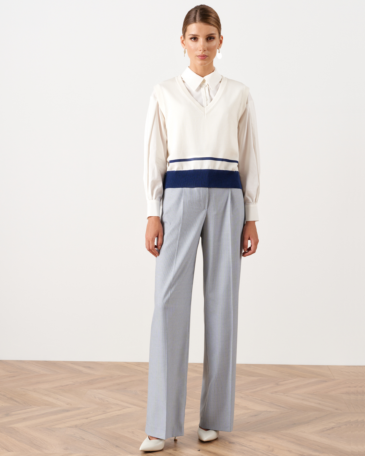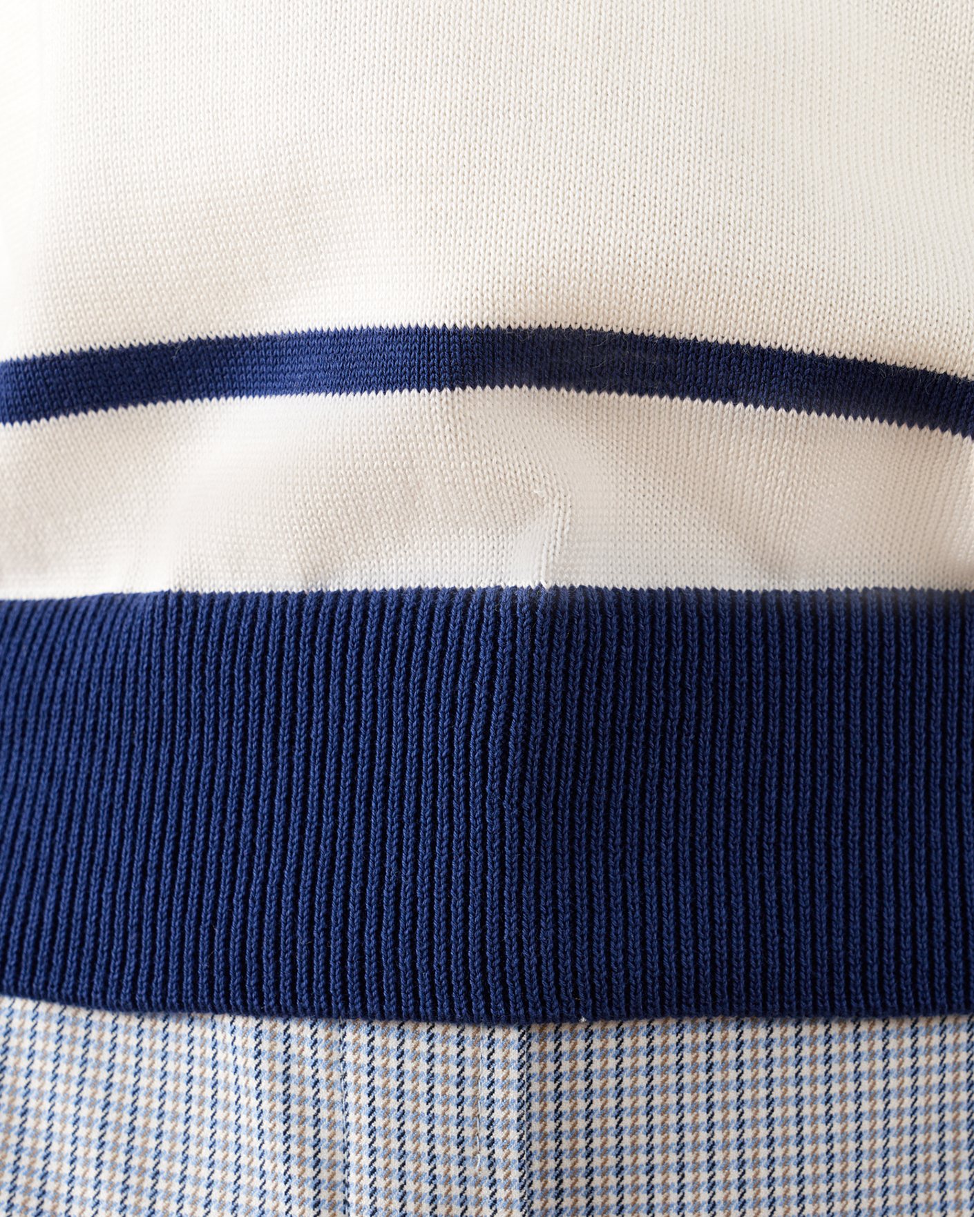 Жилет Nelva сине-белого цвета в горизонтальную полосу по низу. Модель из 100% хлопка с V-образным вырезом и краями на тонкой ребристой резинке. Жилет можно сочетать с рубашкой, блузой, водолазкой, юбкой и брюками.
