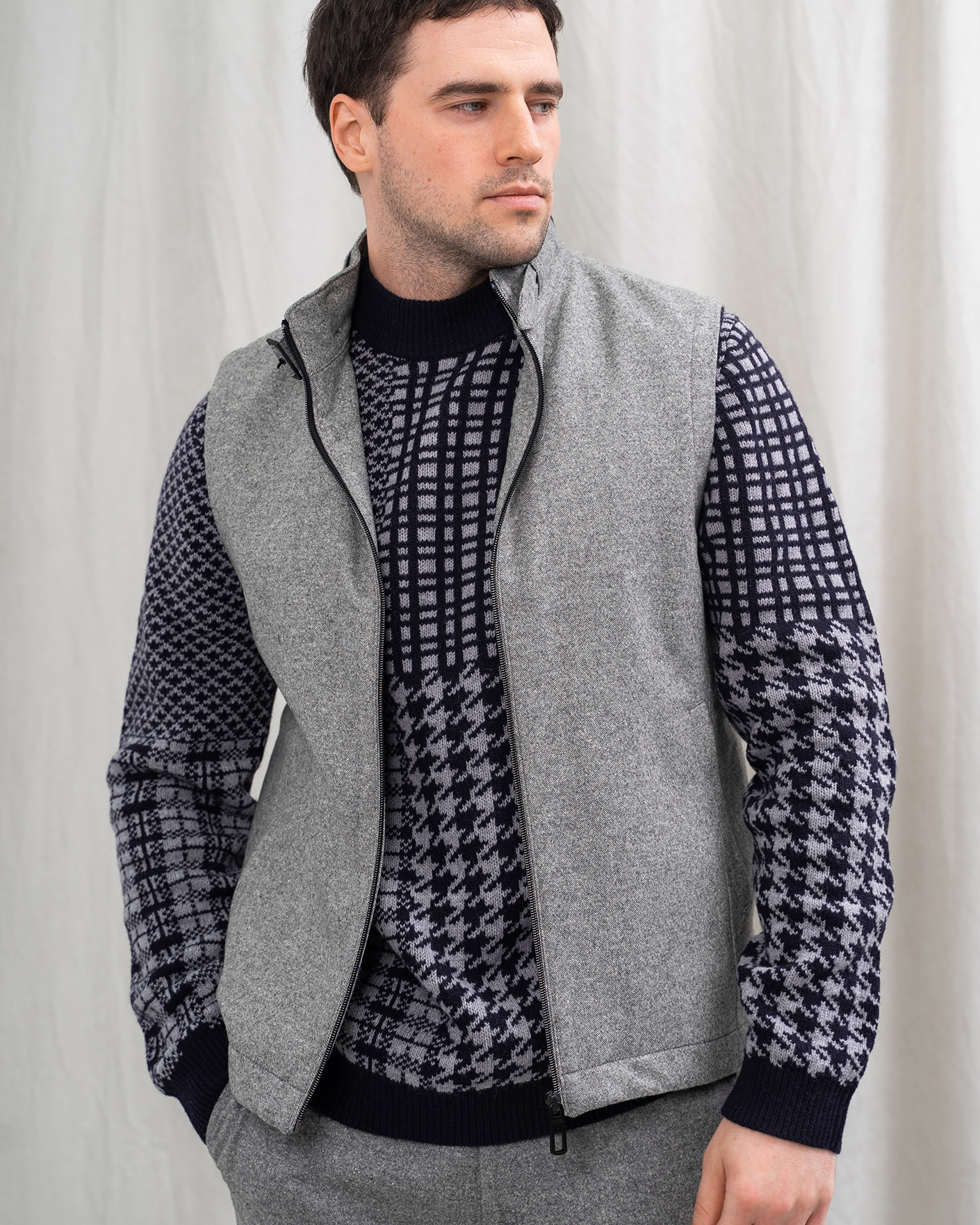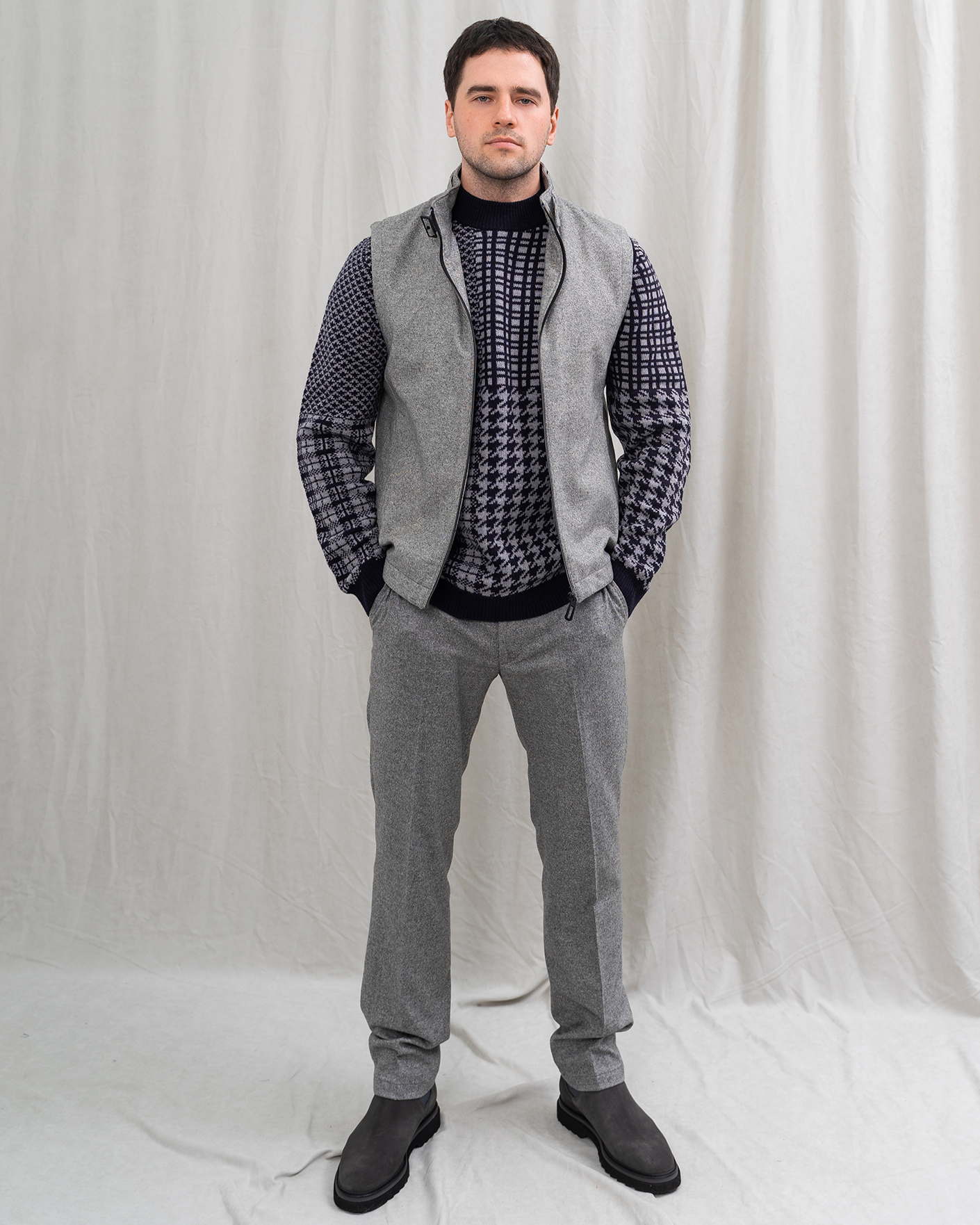 Твидовый жилет Digel серого цвета. Модель с воротником-стойка, декорированным шлейкой с ремешком, застежка на молнию, имеются карманы по бокам. Стильный жилет можно сочетать с рубашкой, джемпером, свитером, водолазкой и брюками.