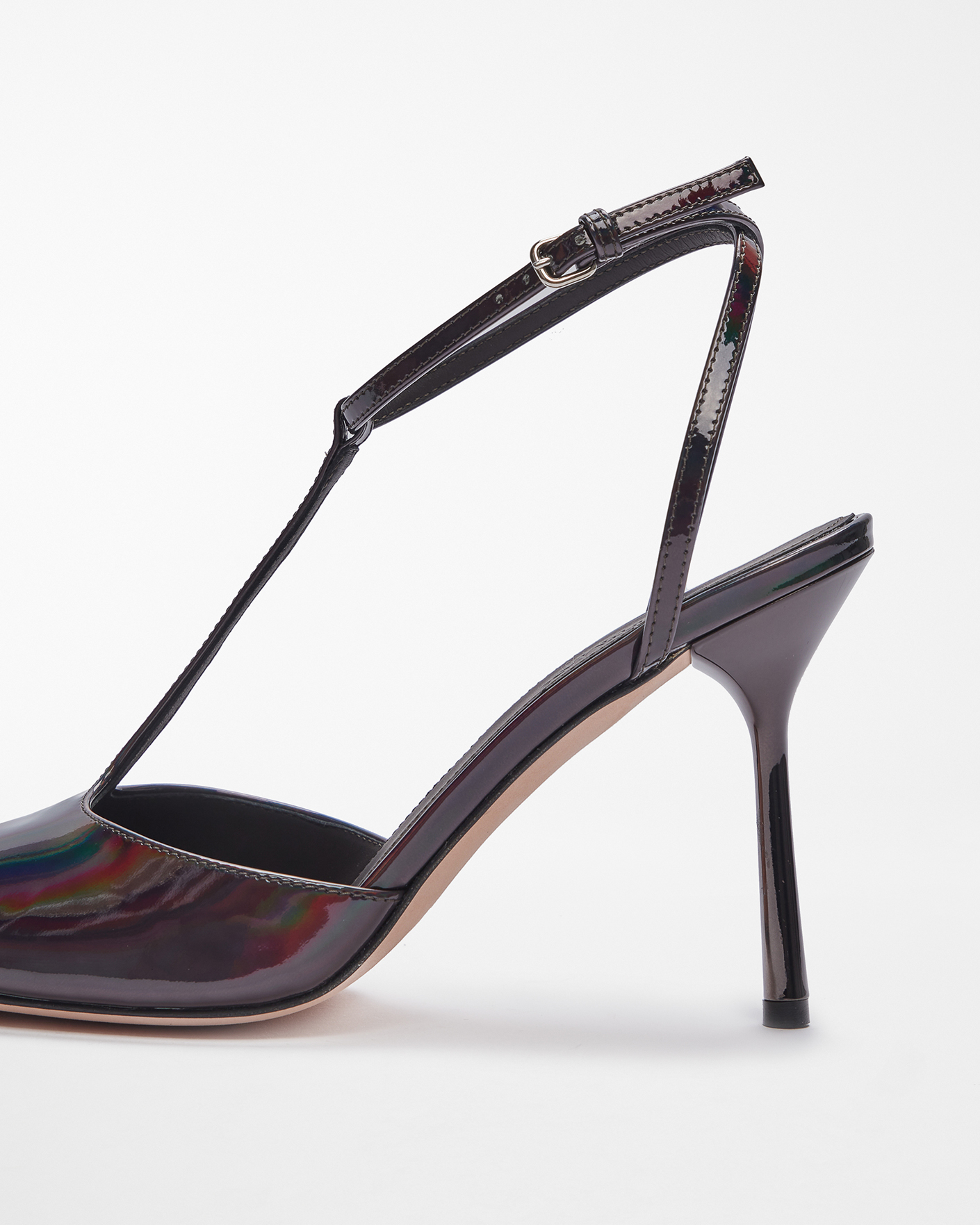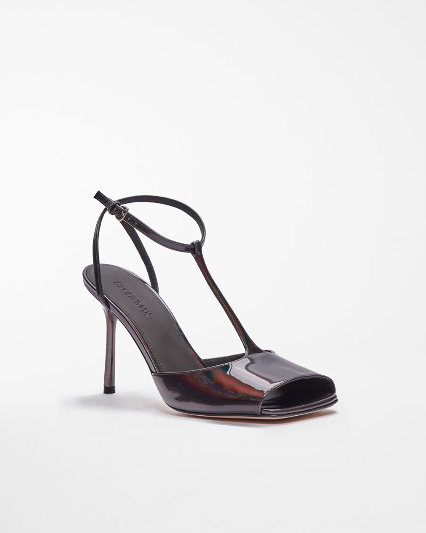 Изящные босоножки Sportmax черного цвета с переливающим эффектом. Модель с открытым квадратным носом, на тонкой высоком каблуке и застежкой на тонкой ремешке. Босоножки идеально дополнят ваш романтичный образ.