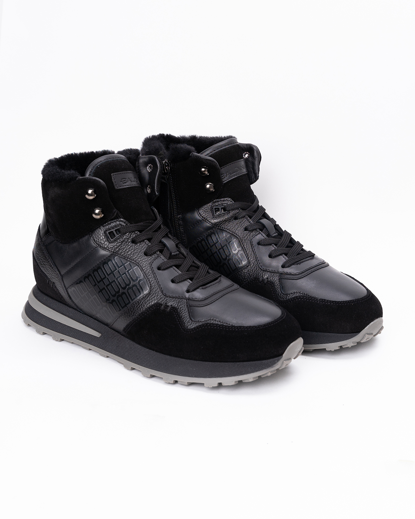 Высокие зимние ботинки Baldinini черного цвета из комбинированных текстур. Модель на шнуровке и внутренней застежке на молнию, теплая подкладка и толстая резиновая подошва. Ботинки идеально подходят для носки в самые суровые погодные условия.