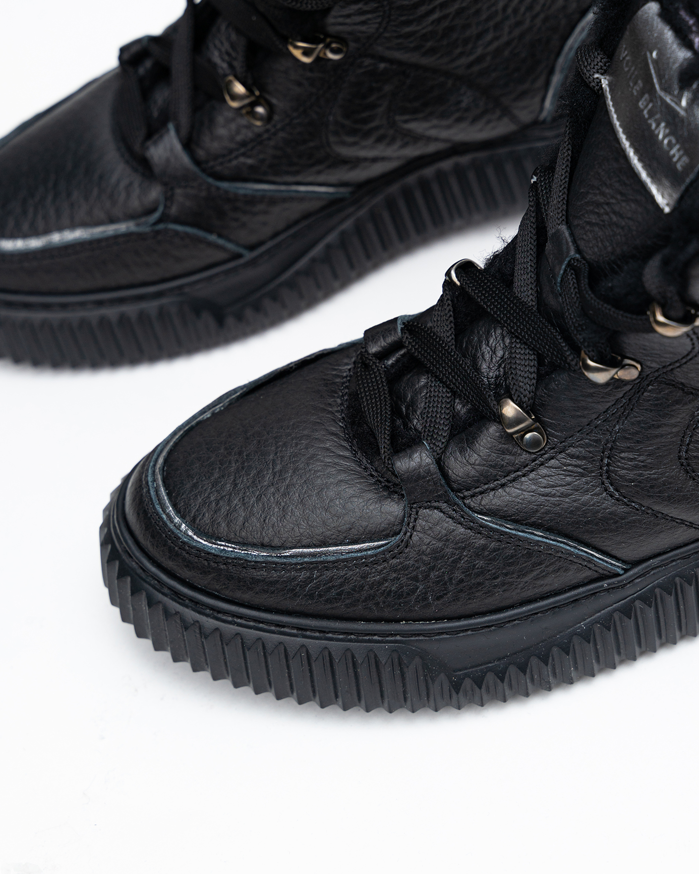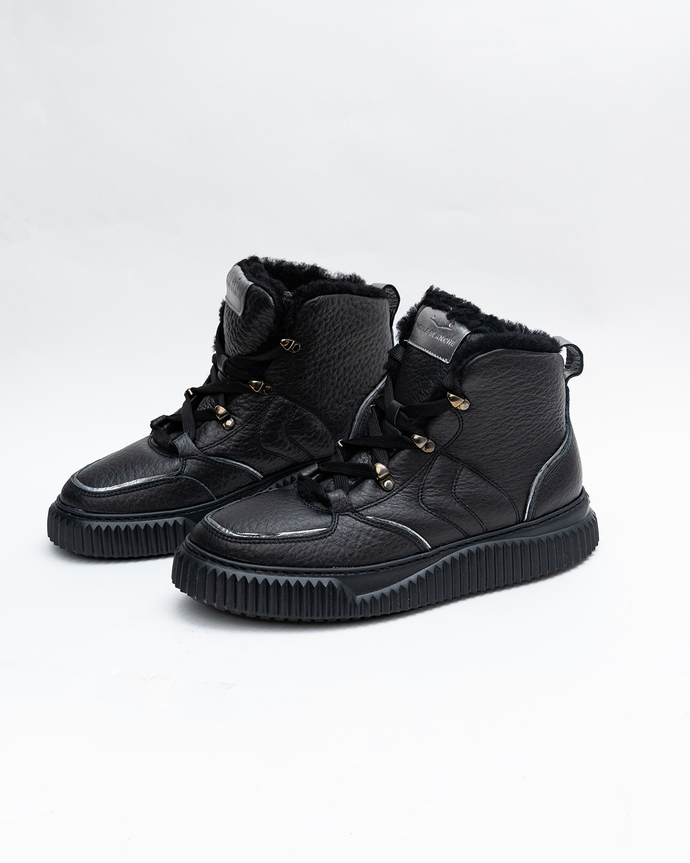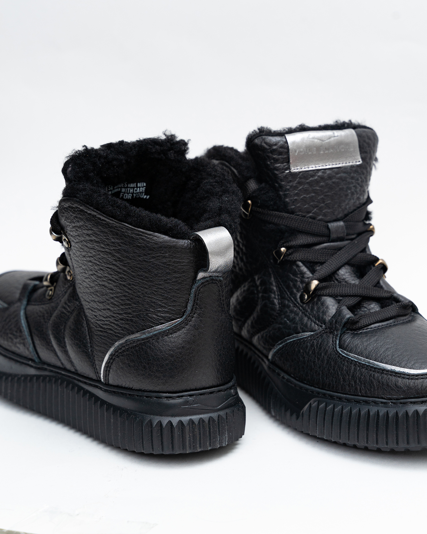 Ботинки Voile Blanche черного цвета выполнены из 100% зерненой кожи. Высокая модель на шнуровке, декоративными швами, а также меховой внутренней отделкой. Резиновая рельефная подошва обеспечивает максимальное сцепление с поверхностью. Ботинки станут идеальными компаньонами в холодное время года.