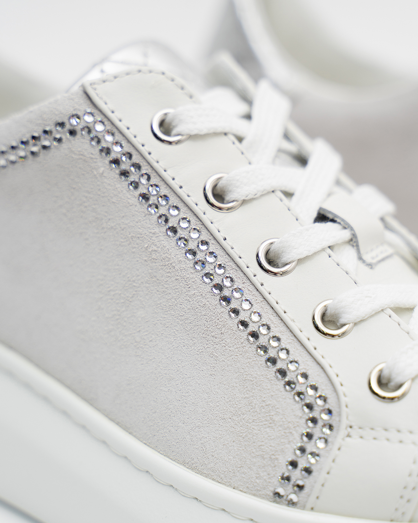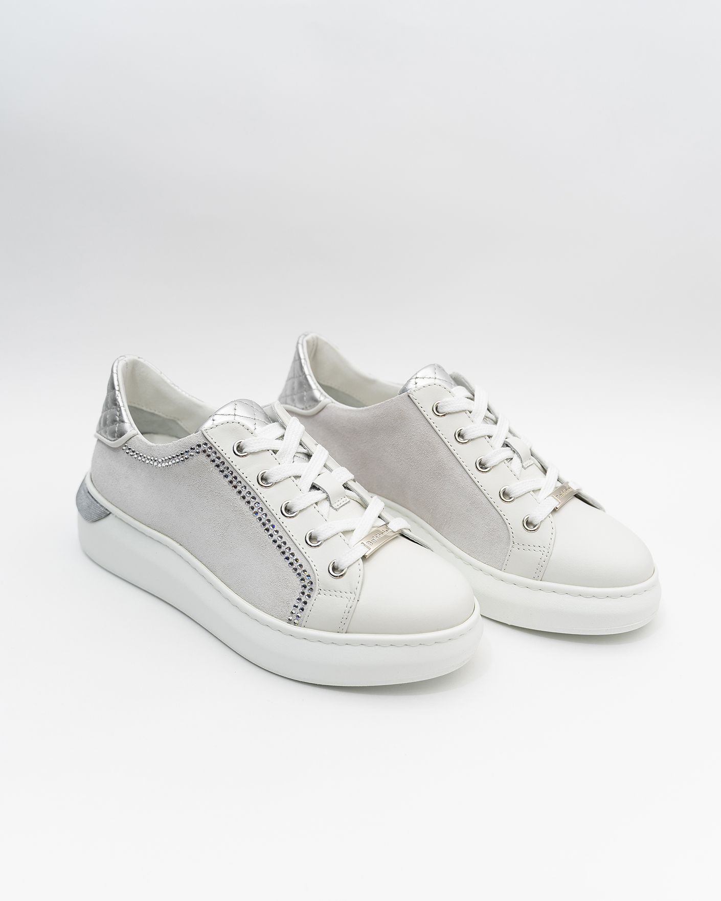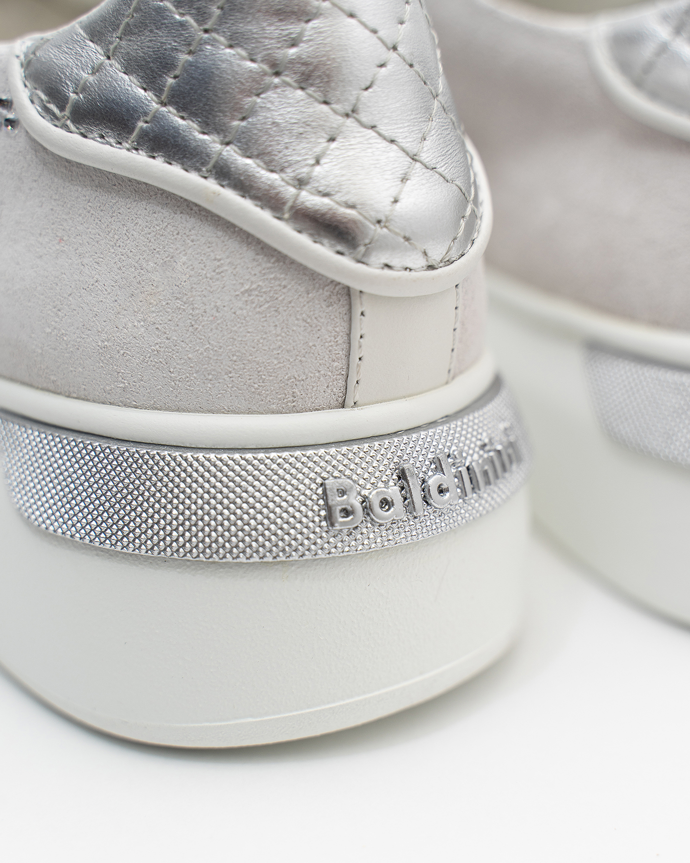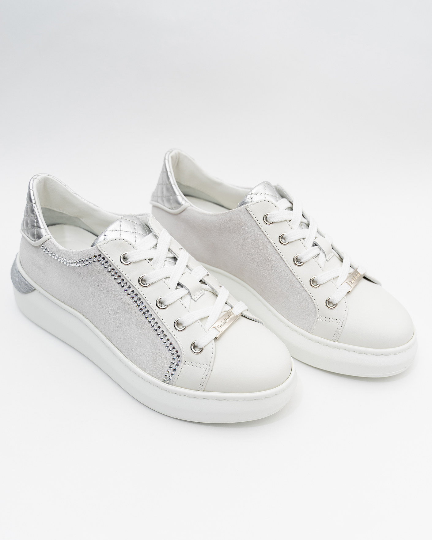 Кеды Baldininni бело-серебряного цвета выполнены из 100% кожи и замши. Модель на шнурковке с металлическим логотипом бренда. Пятка и язык в ромбическую стежку, также имеется декор в виде страз. Резиновая подошва обеспечивает комфортное и идеальное сцепление с поверхностью. Кеды - незаменимый повседневный выбор.