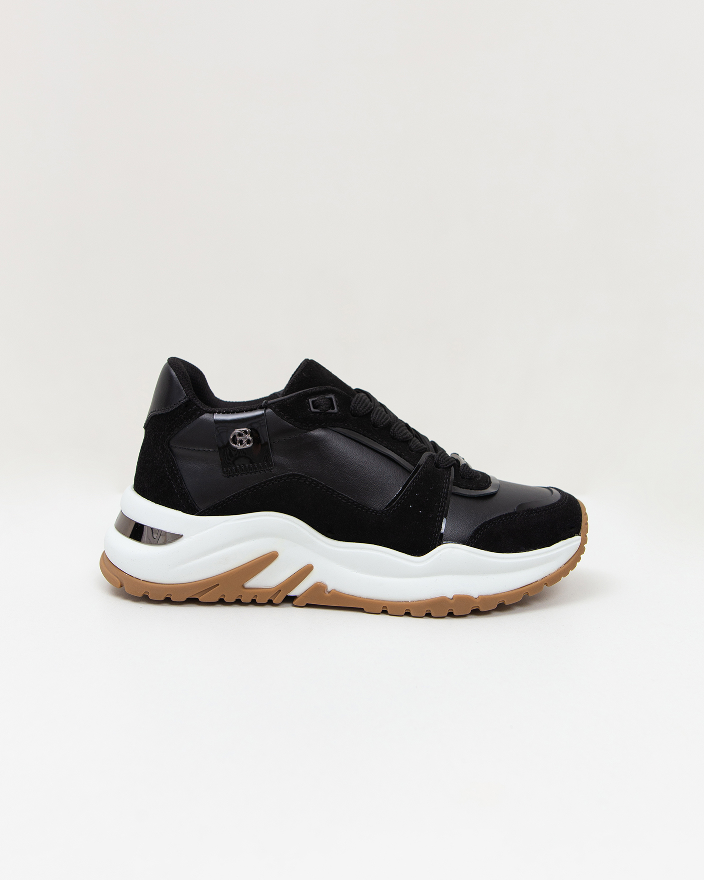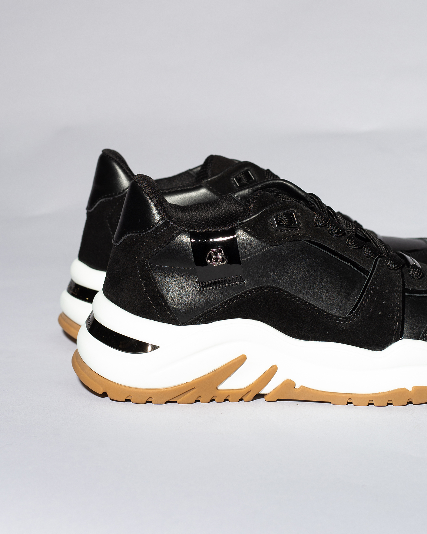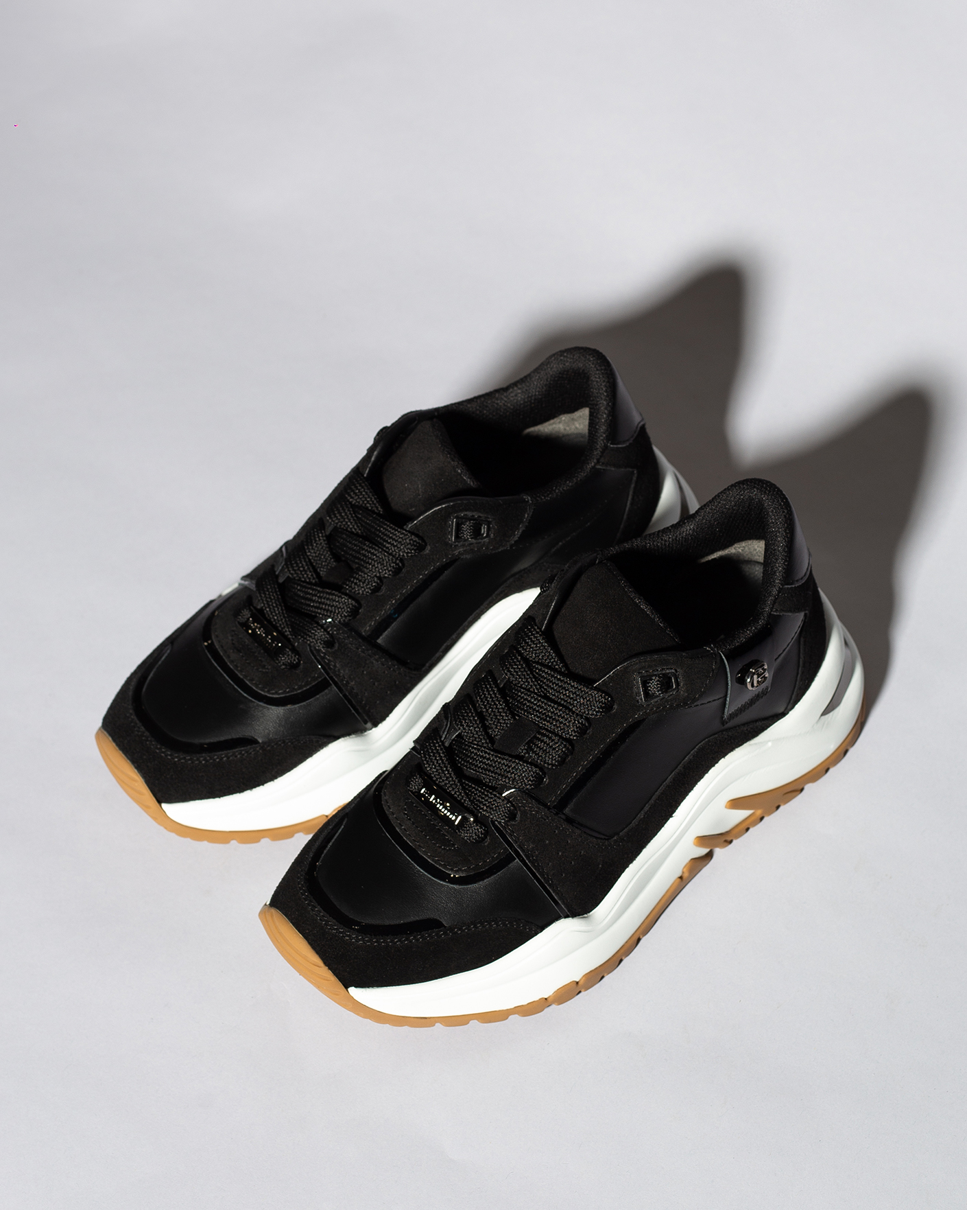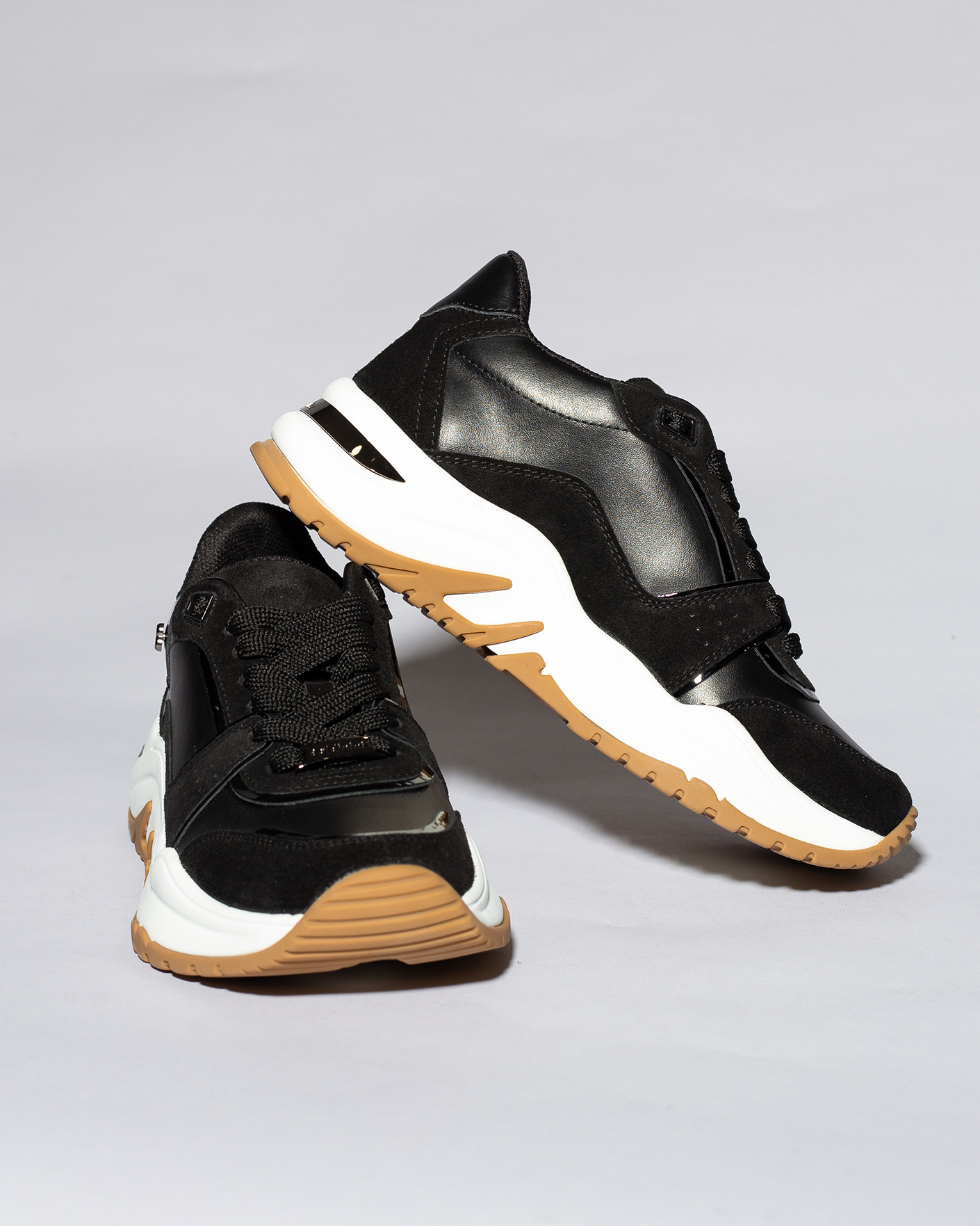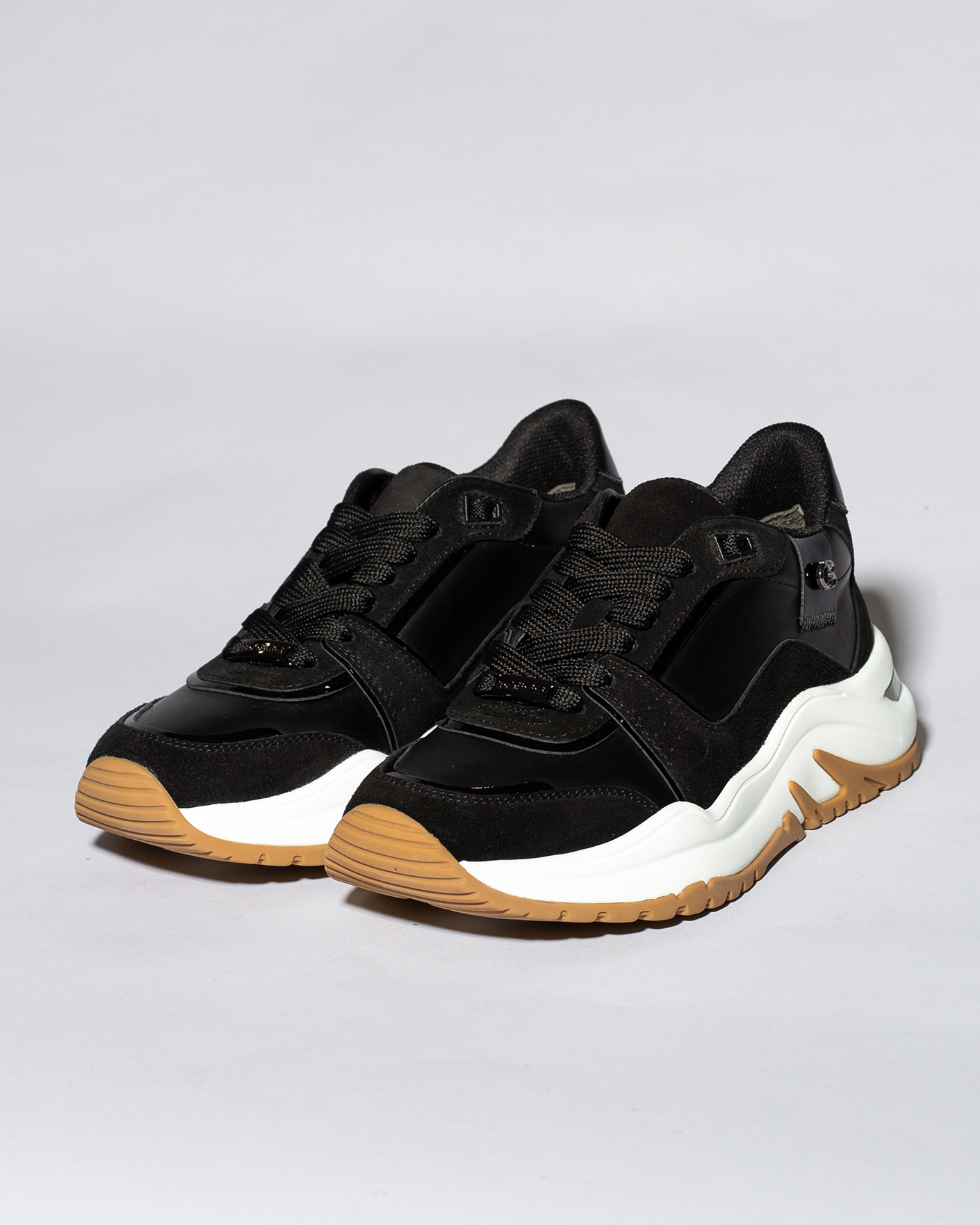 Повседневные кроссовки Baldinini черного цвета на контрастной белой подошве. Модель выполнена из комбинированной кожи и замши, а также с лаковыми вставками. Функциональная шнуровка и металлические логотипы придают необычный характер этой паре. Кроссовки отлично сочетаются с повседневным гардеробом.
