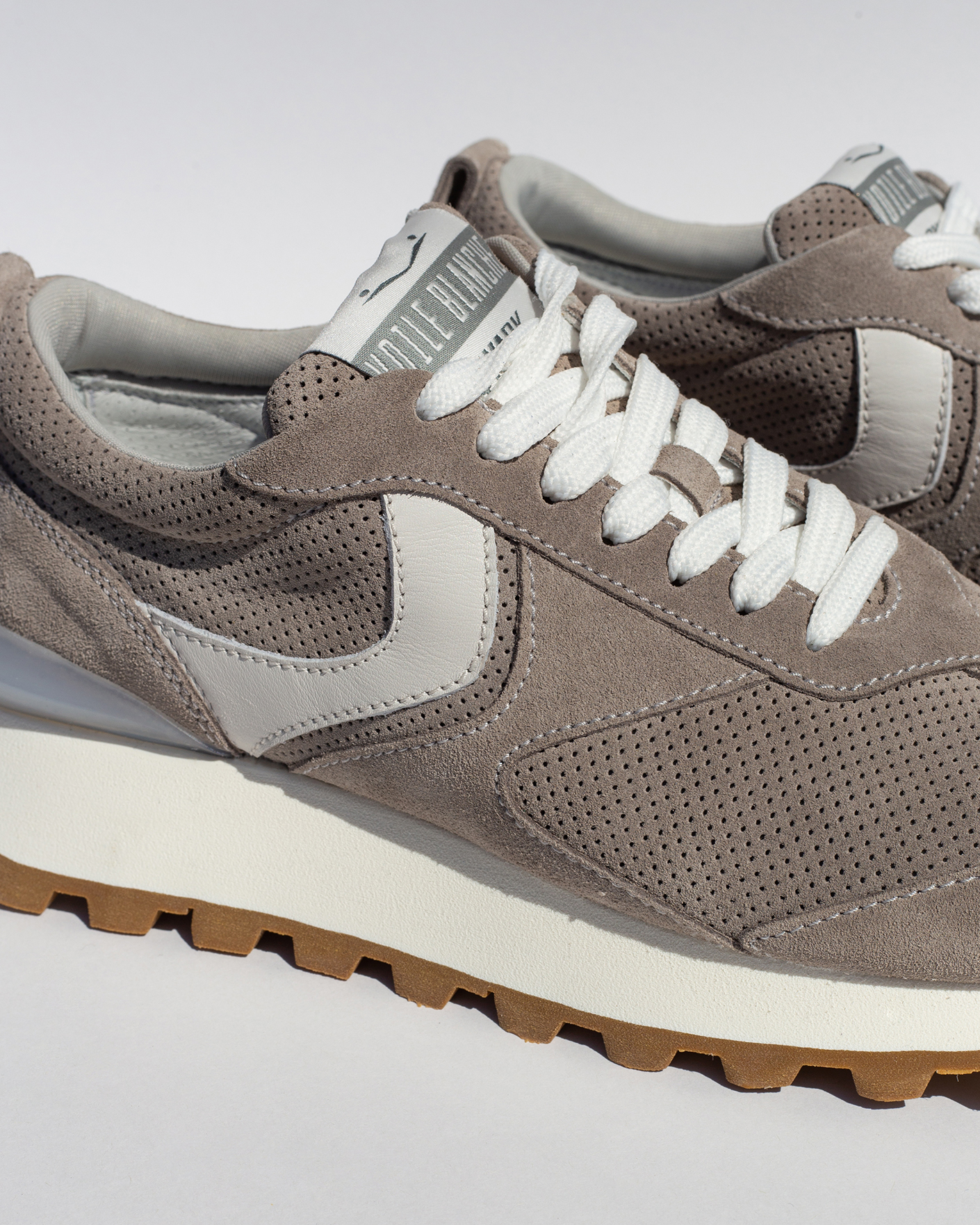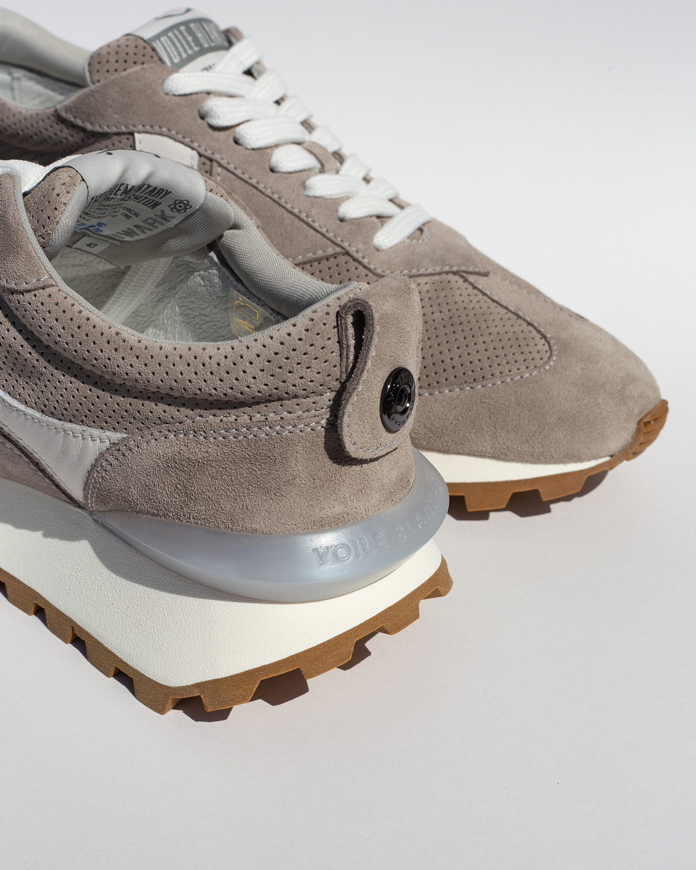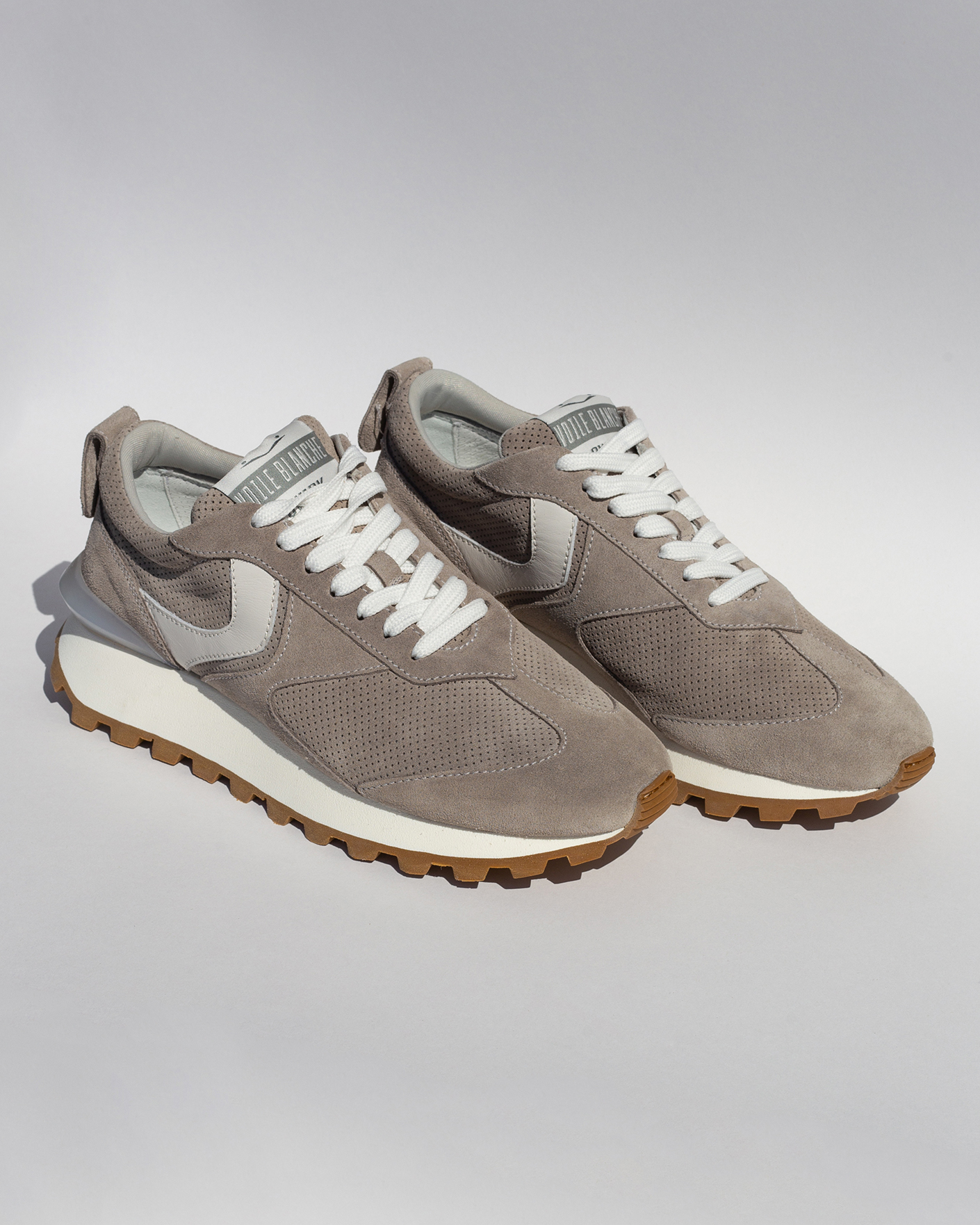 Повседневные кроссовки Voile Blanche серо-бежевого цвета. Кожаная модель с текстурными вставками и в мелкий перфорированный рисунок. Шнуровка белого цвеа и комфортная резиновая подошва. Кроссовки станут вашими фаворитами.