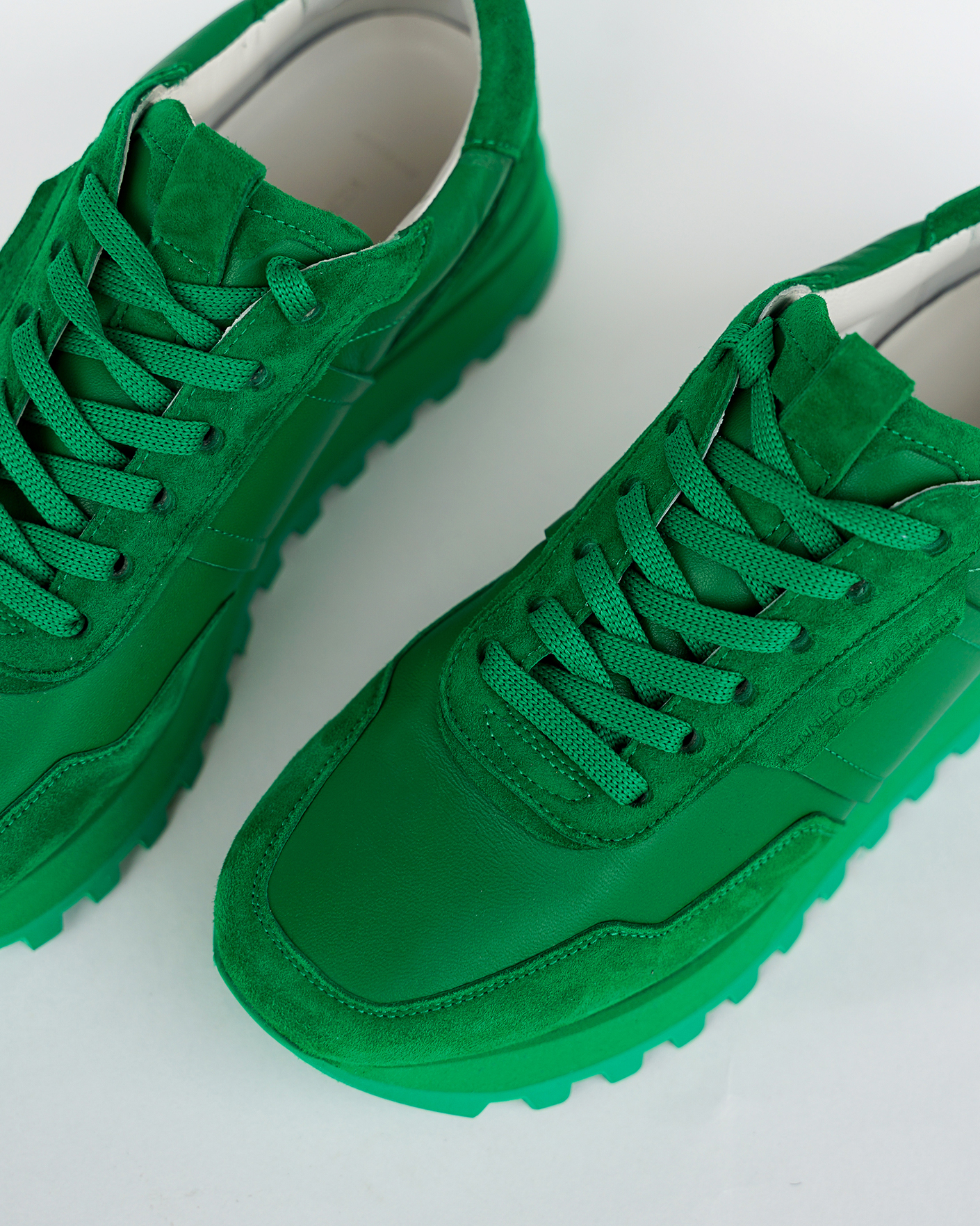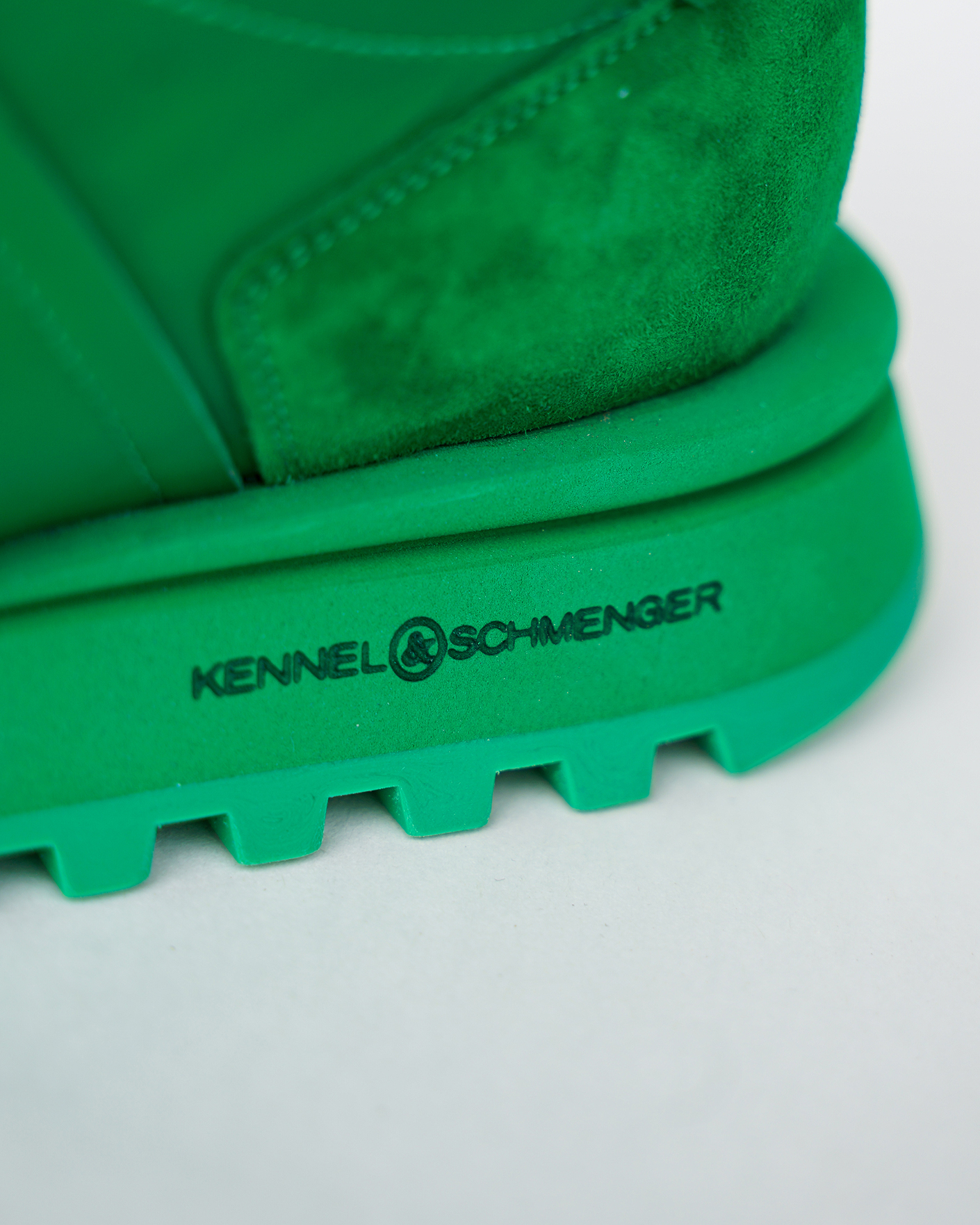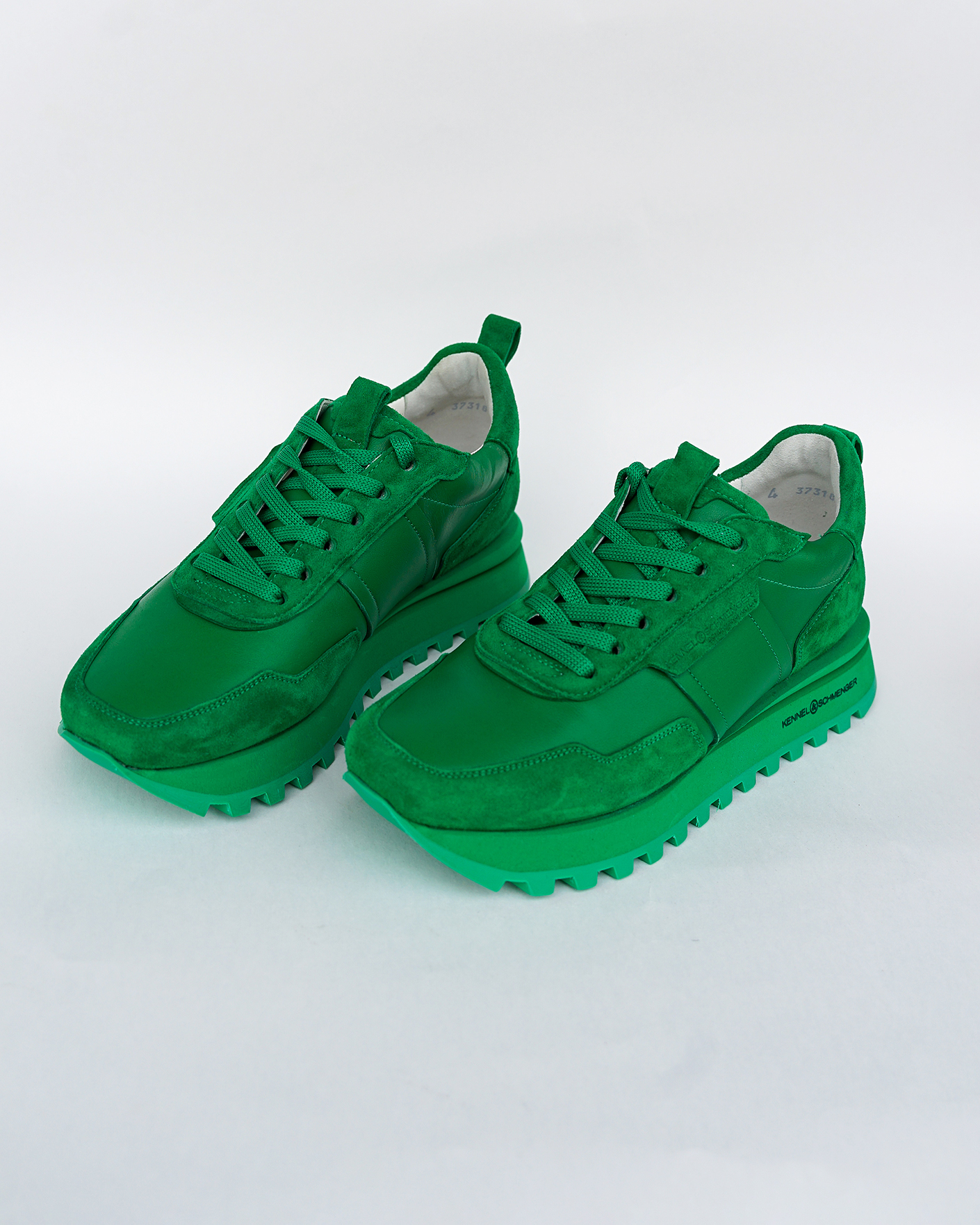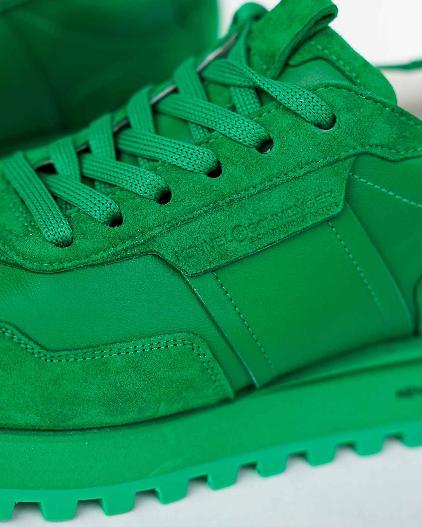 Кроссовки Kennel&Schmenger зеленого цвета выполнены из комбинированной кожи. Модель на шнуровке, вбитым логотипом по корпусу, широкая ребристая подошва в тон. Удобные и яркие кроссовки для идеальных прогулок.