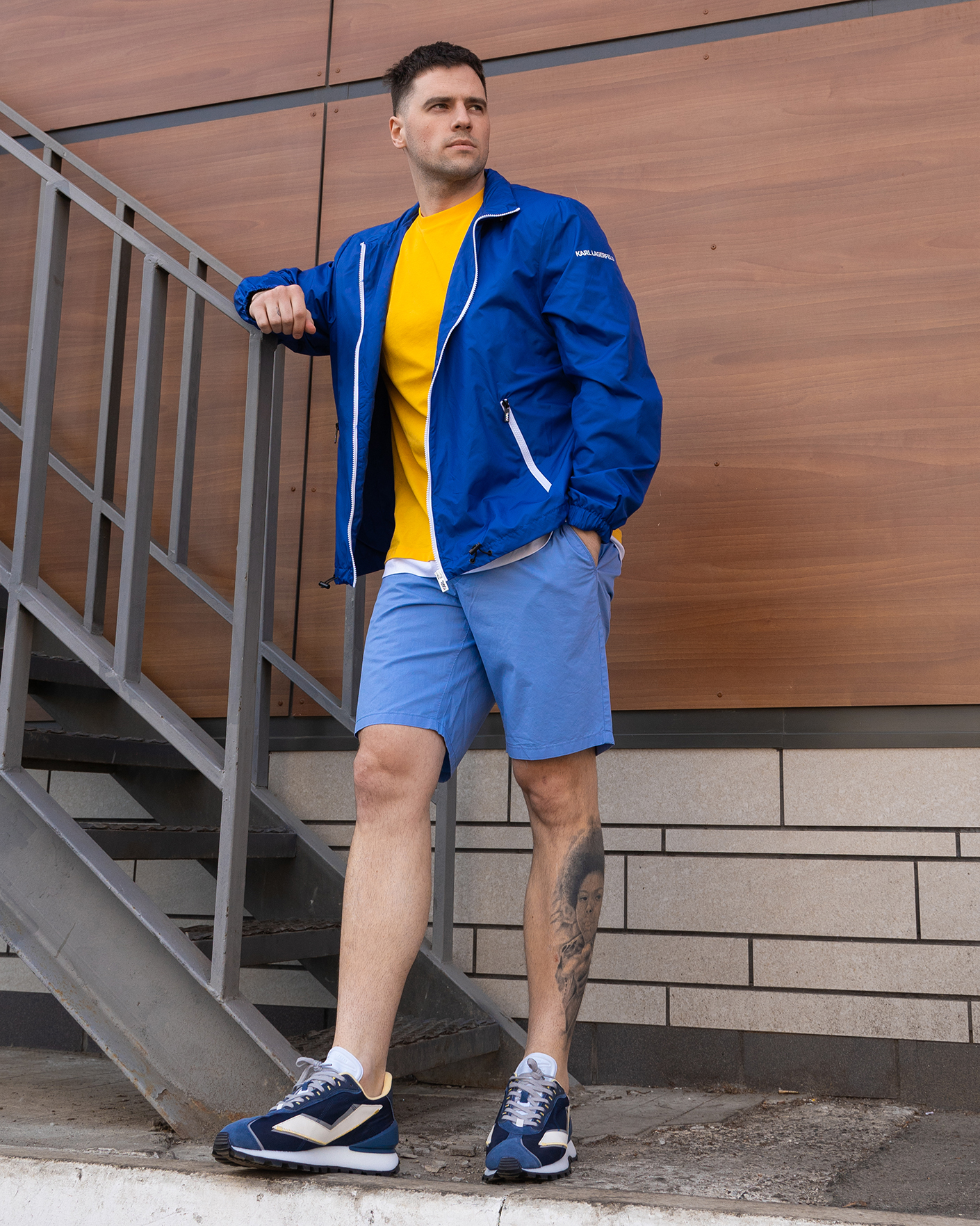 Яркий образ в спортивном стиле для прогулок: ветровка, футболка, шорты-чино