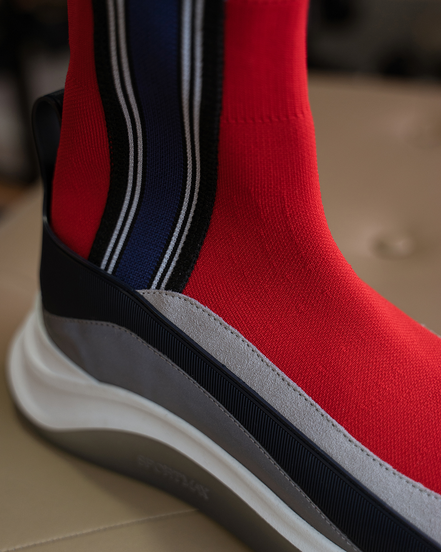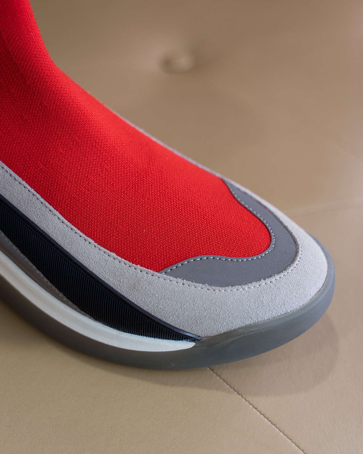 Кроссовки-носки Sportmax красного цвета. Высокая модель с контрастными вставками на резиновой подовше. Кроссовки-носки можно носить не только со спортивной одеждой, но и с платьями и юбками.