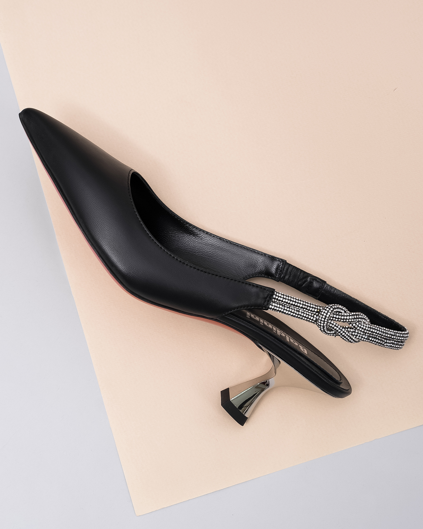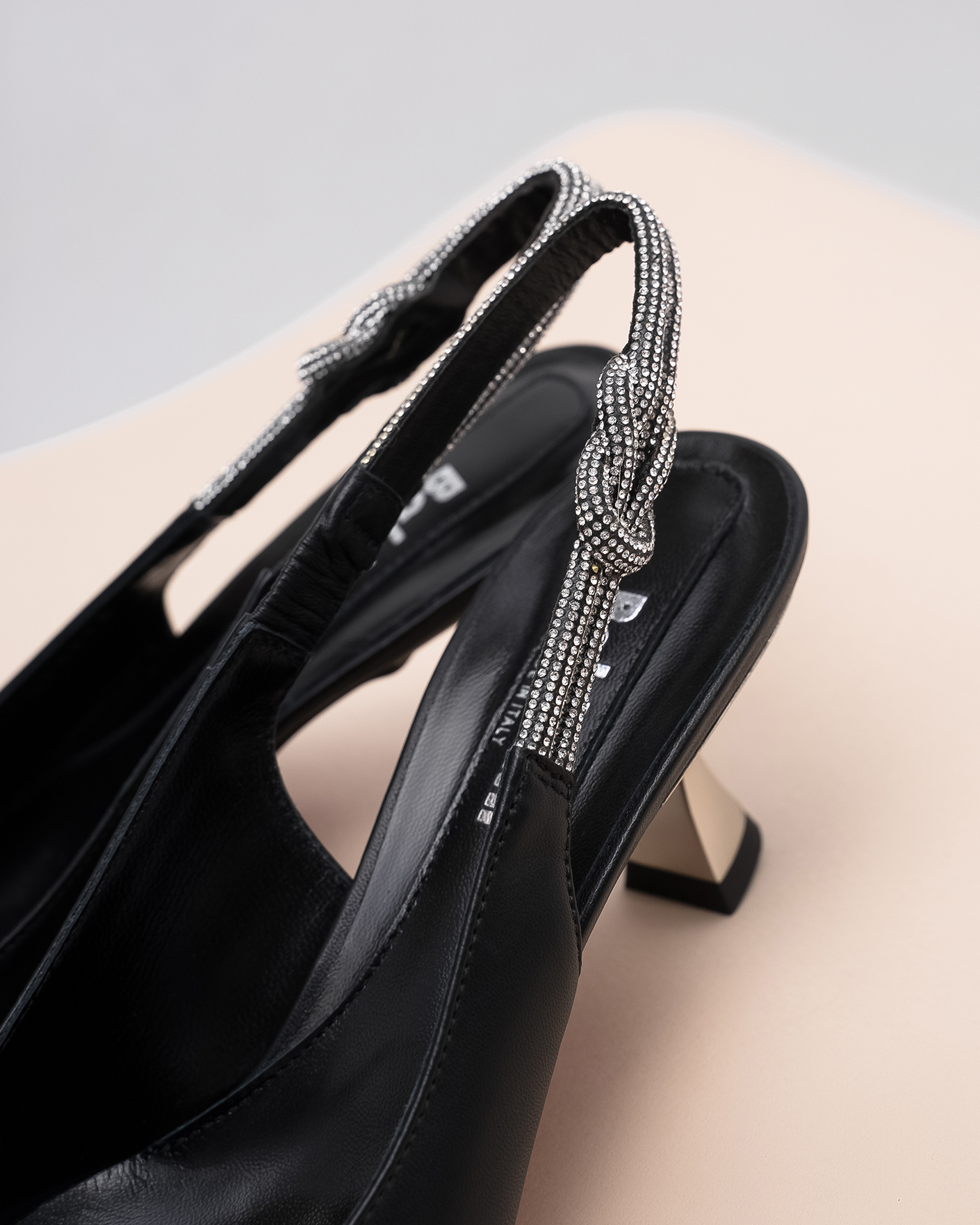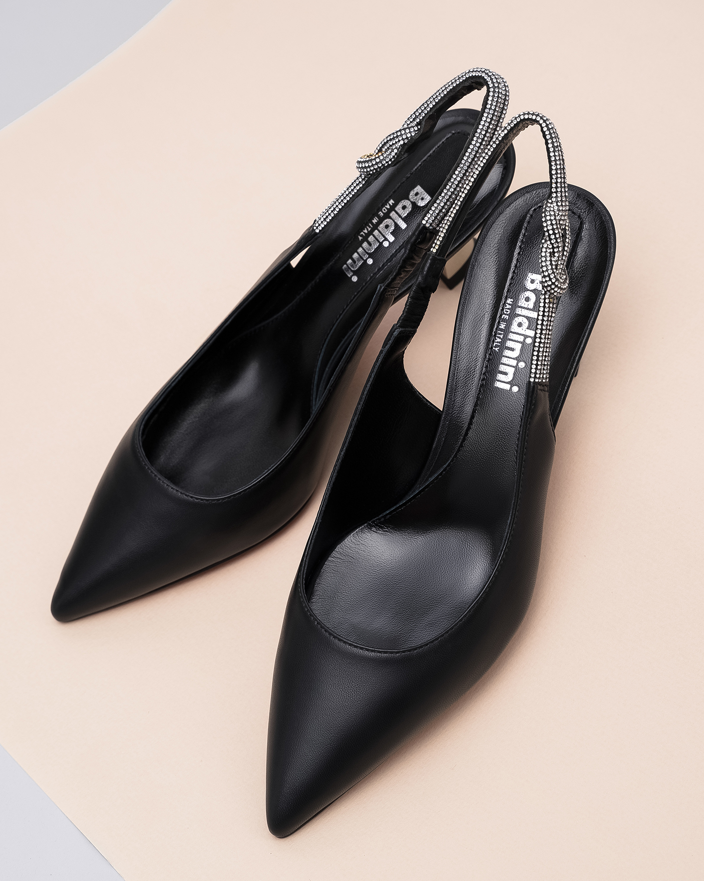 Кожаные туфли-лодочки Baldinini черного цвета. Модель с острым носом, открытой пяткой, застежка которой декорирована стразами. Небольшой каблучок выполнен в серебряном цвете. Туфли-лодочки идеальны для торжественных мероприятий.